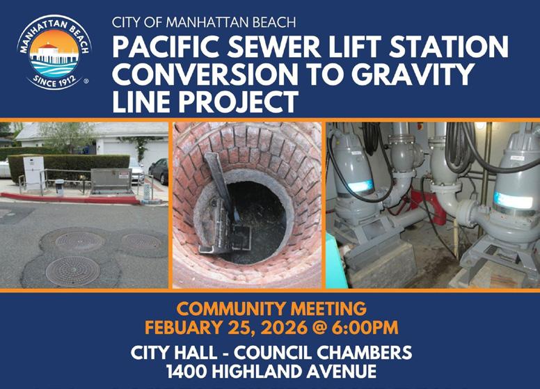 For more information about the project, please visit the Pacific Sewer Lift Station Conversion to Gravity Line webpage at www.manhattanbeach.gov/pacific or or e-mail Marzena Laskowska, mlaskowska@manhattanbeach.gov