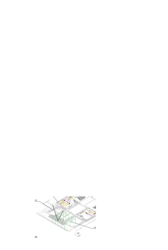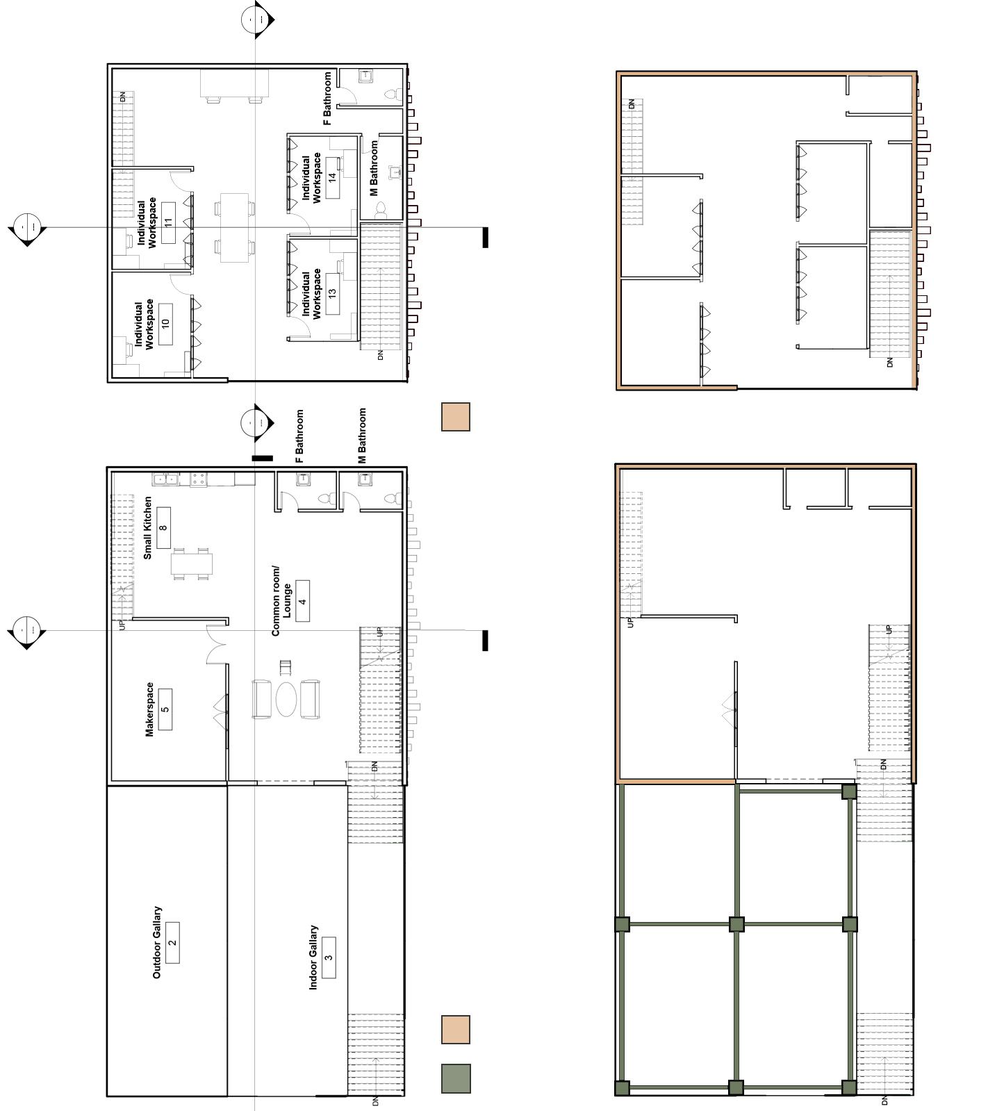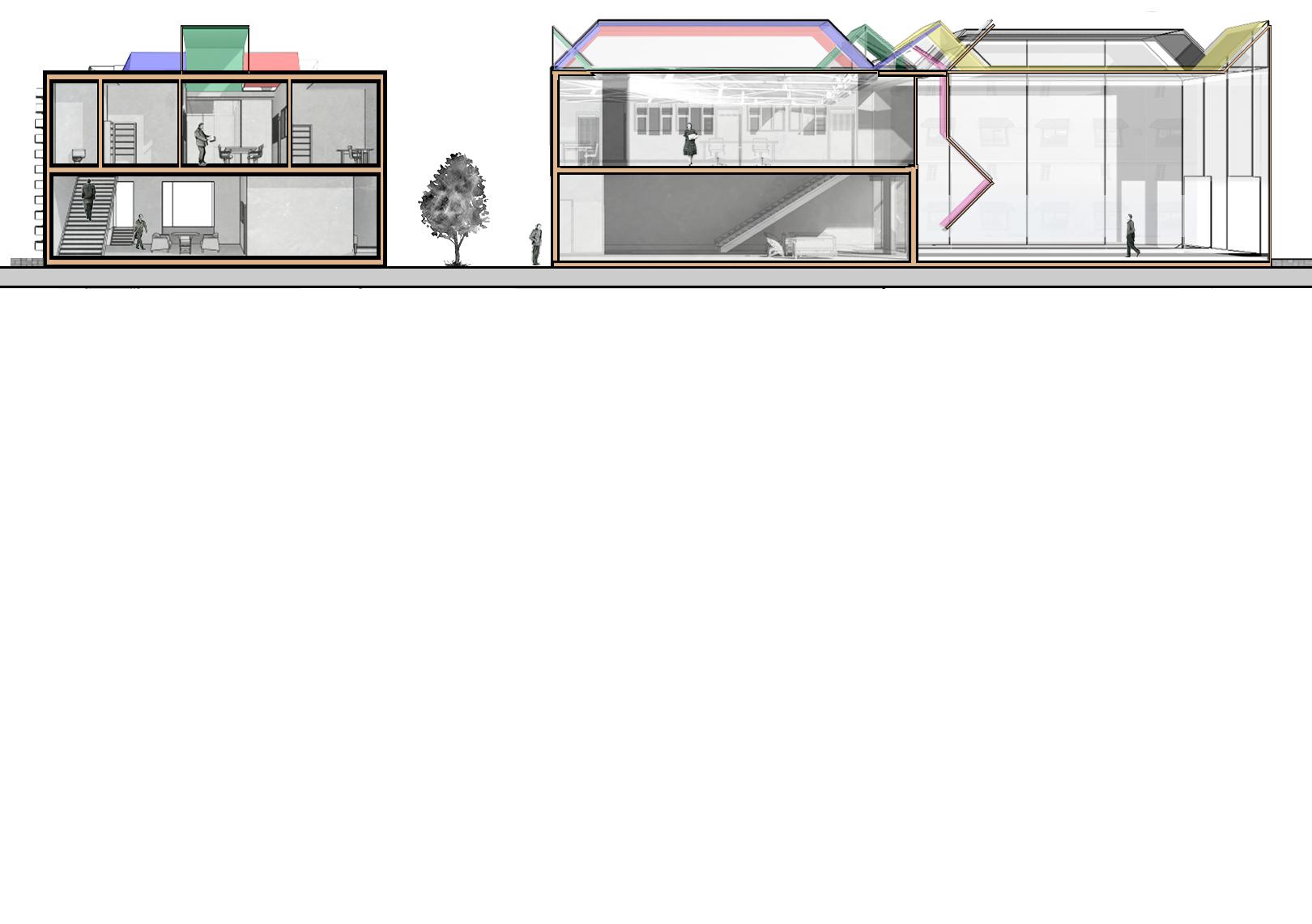 Graphic Duality is located in Marietta Square and acts as a statement to the area. The proposal is an art museum that has the artist’s studio incorporated into the building. The design is inspired by the process of making digital art and then producing it in the physical world. The art gallery space is separated into three sections: an outdoor gallery, an interior gallery, and an underground gallery. The underground gallery is used for display of digital art, while the outdoor gallery has a permanent art installation of ribbons. The ribbons create the roof of the building with the flowing and wrapping around the form. These undulate and create openings for skylights to let natural light into the gallery and the studio. They represent the digital and physical world with the ribbons above the studio being in RGB, which represents the digital world, and the ribbons above the gallery being in CMYK which represents the physical world. Lastly the side of the building has an interactive kinetic art piece in which users are able to be manipulated and represent pixels on a screen. Overall, the project disassociates itself from the brick theme of Marietta square and stands out on purpose in order to express the uniqueness and creativity inside the gallery.