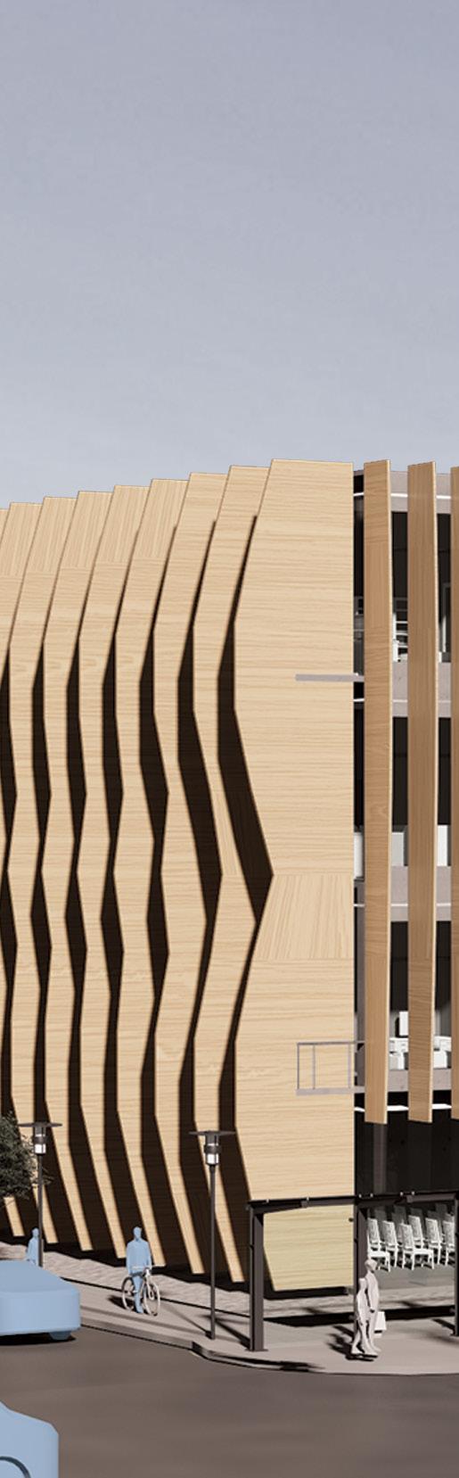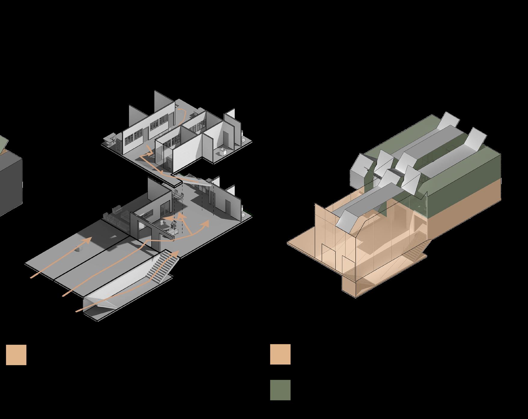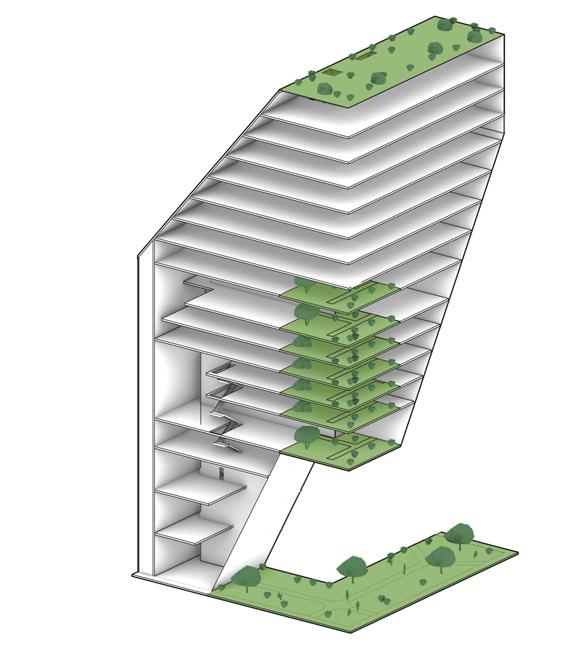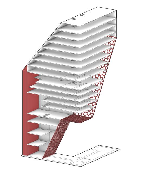 This proposal is located in Kirkwood, Atlanta. It is a fastdeveloping neighborhood and has a public library in the center of the town. Due to its expansion housing prices are rapidly increasing, forcing the original residents out of their homes. To combat this this proposal plans to rebuild the library on site and add a large amount of low-income housing on top of the library. This is cost efficient because the land is government property, which allows for housing prices to be lower. The income produced by the housing will fund the library for the future. The design is centered around large sun shading blades that are oriented vertically to combat the west and eastern sun. These blades act as a privacy boundary for the residents because from the interior the view is unobstructed but from the outside perspective the units are near impossible to see inside. The blades also are carved around each unit which allows for them to become the balconies for each of the residents. This allows for the blades to separate each unit from one another and doubles as the railing for the balconies. Lastly the blades come inside of the library to direct the circulation path while also opening up a skylight to provide natural light for the interior of the library.