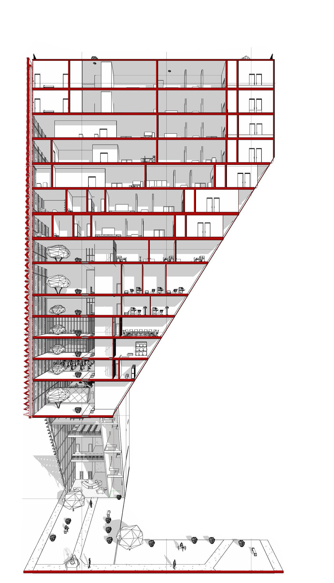 This project is located in the neighborhood of Gangnam in Seoul, South Korea. This area is known for its rich lifestyle and for its immense wealth. The area however lacks physical training centers such as gyms, with the only ones available at schools. This proposal tackles this and more by integrating physical training with physical therapy with residential apartments. This allows for the people in Seoul to have a center where they can receive specialized training or the rehabilitation that they might need, while also replacing the housing that the building replaces. The form comes from an approach on efficient FAR and is designed around the outdoors and exercise. The Ground level has a large integrated park that promotes movement and health, while inversely at the top the large mass allows for numerous residents and raises them high enough away from the noise of the city. The structure is composed of a large thick core which acts as a counterbalance as well as a space frame system to resist against moment forces. Lastly, the façade is composed of mechanical apertures that open and close and is inspired by muscle contractions. This allows for the building to allow maximum natural light to come into the building while being able to close off light due to harsh direct rays.