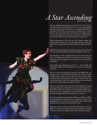 After her high-flying performance in the title role of Peter Pan on the MBS stage last spring, Alexa Rojek ’15 was one of six budding high-school thespians nominated for a coveted Paper Mill Playhouse Rising Star Award. The annual awards are modeled after the Tony Awards, with nearly 100 entered productions from public, private, and parochial high schools. Previous winners have included Oscarwinner Anne Hathaway and Broadway favorite Laura Benanti. Rojek’s performance as Peter Pan not only included singing and dancing, but also “flying” over the Founders Hall stage with some help from the widely-respected theatrical flying company Flying By Foy. MBS Performing Arts Department Chair Susie Speidel, who directed the musical, praised Rojek for her skill and leadership in Peter Pan. “Alexa Rojek is a terrific young lady who has a lot of talent, but also has an incredible work ethic. She was truly the heart and soul of our production, and she inspired the rest of the cast in every rehearsal,” said Speidel. Flying added extra dimension to the show — both visually and technically. Speidel noted that Rojek was a natural in learning this new skill. “We had a great time bringing this musical to the MBS stage, and bringing in the technician from Flying By Foy to help us create that extra theater magic was the icing on the cake,” she said. “Alexa excelled at flying, too, and took to it with ease. We knew that our new performing arts facility at Founders Hall gave us the technical capacity to do such a large and complicated show.” Before her memorable role as Peter Pan, Rojek delivered an awardwinning performance as Puck, the clever and mischievous sprite in A Midsummer Night’s Dream. She won the “Outstanding Performance by an Actress in a Leading Role in a Classical Work” category at the 2013 Theatre Night Awards at Montclair State University. She has also appeared on the Founders Hall stage as Katherine Wiley, the intrepid president of the New Jersey Consumers’ League, in the gripping historical drama Radium Girls. Before that, she portrayed Mrs. Macafee in the musical comedy Bye Bye Birdie. When the curtain rises for the 2014-2015 performing arts season at MBS, it’s a safe bet that Rojek will once again be taking center stage in Founders Hall, showcasing her talents and reaching new heights.