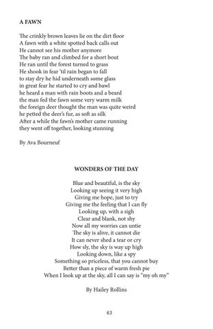 A FAWN The crinkly brown leaves lie on the dirt floor A fawn with a white spotted back calls out He cannot see his mother anymore The baby ran and climbed for a short bout He ran until the forest turned to grass He shook in fear ‘til rain began to fall to stay dry he hid underneath some glass in great fear he started to cry and bawl he heard a man with rain boots and a beard the man fed the fawn some very warm milk the foreign deer thought the man was quite weird he petted the deer’s fur, as soft as silk After a while the fawn’s mother came running they went off together, looking stunning By Ava Bourneuf
