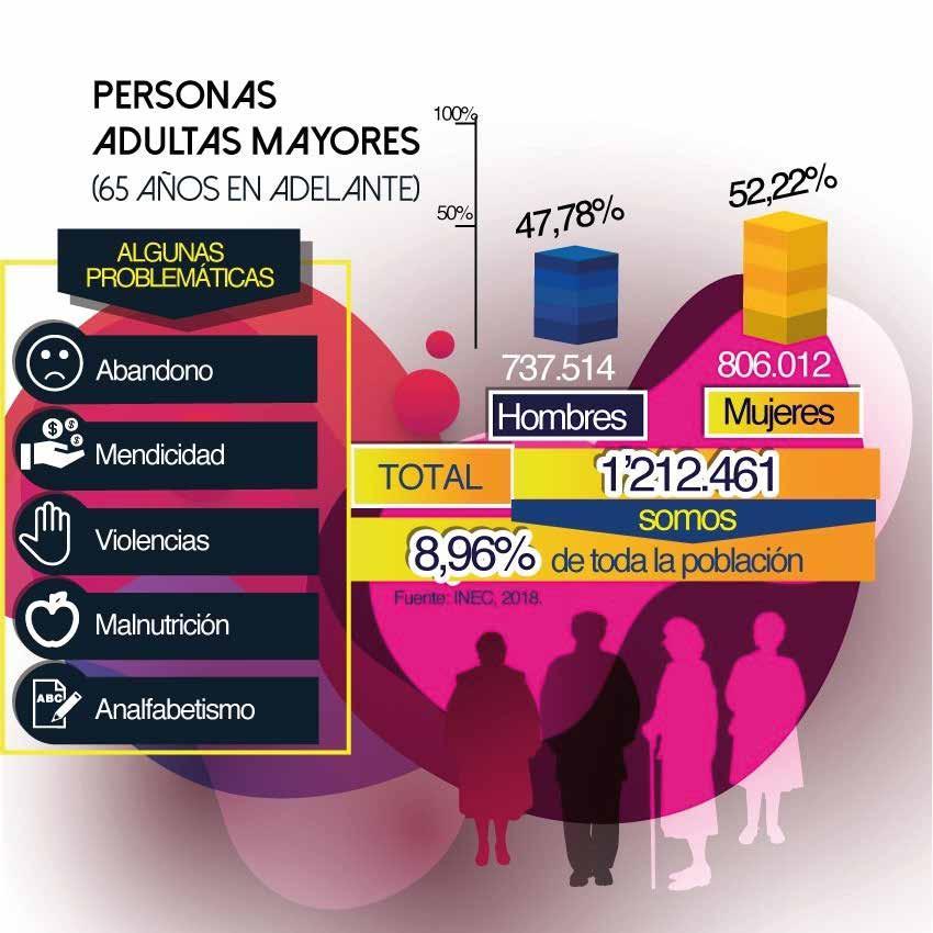 Según indicadores sociales y económicos, en el Ecuador la pobreza afecta al 17,6% de la población adulta mayor. Aproximadamente, 500.000 personas adultas mayores están en situación de pobreza y 60.000 en pobreza extrema; sus niveles de escolaridad son muy bajos, un 26,5% es analfabeta y el 27,2% tiene primaria inconclusa.