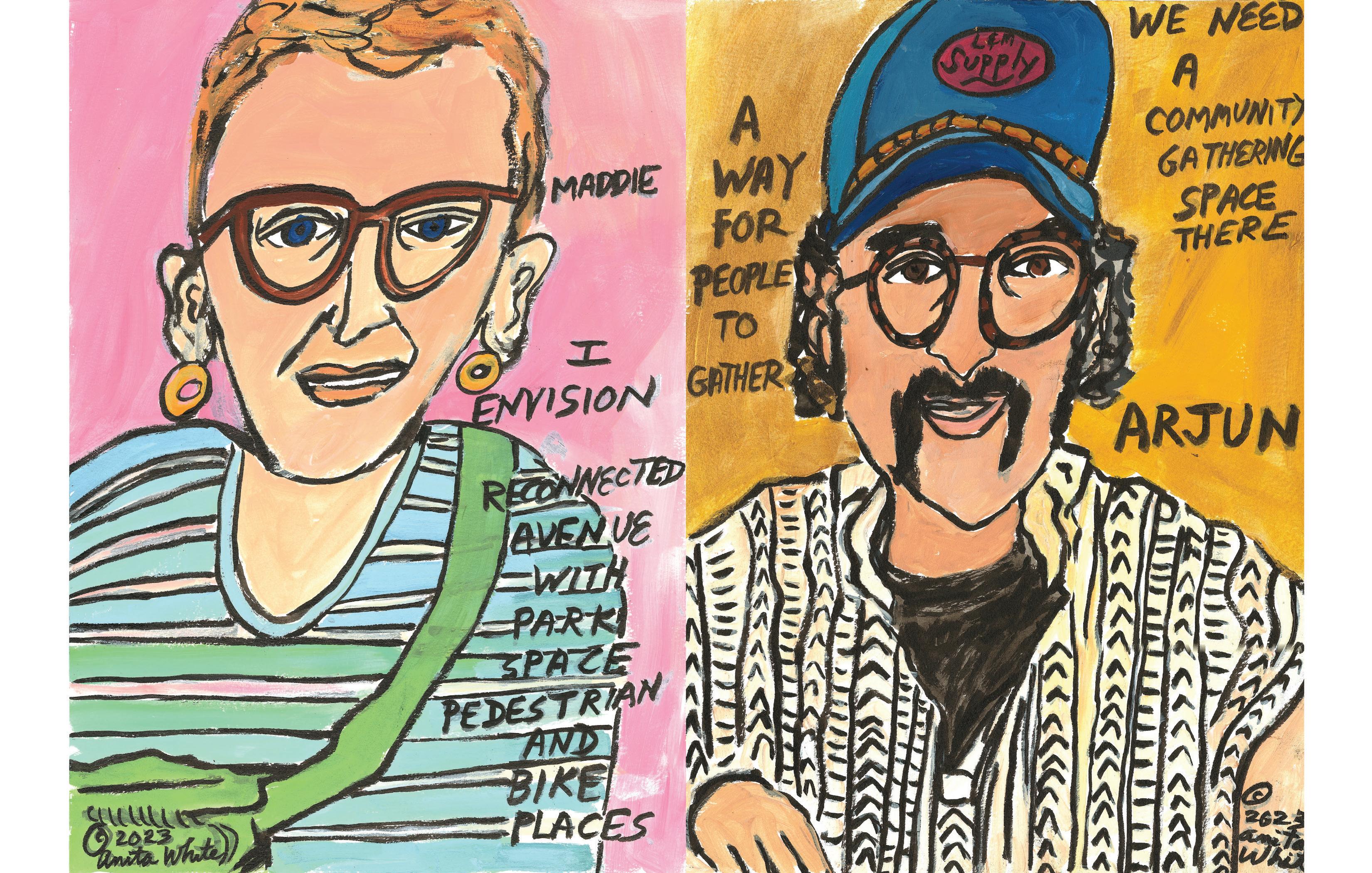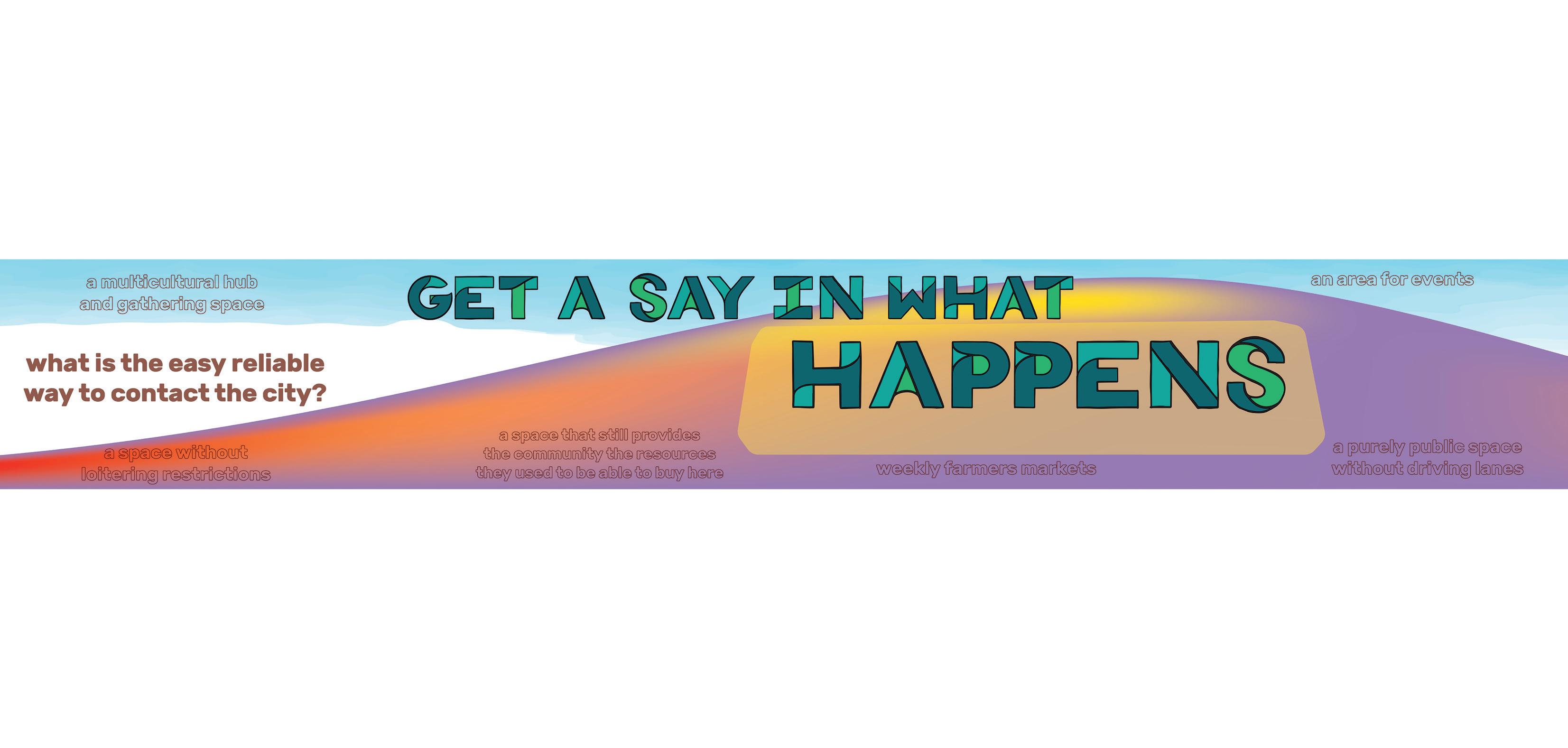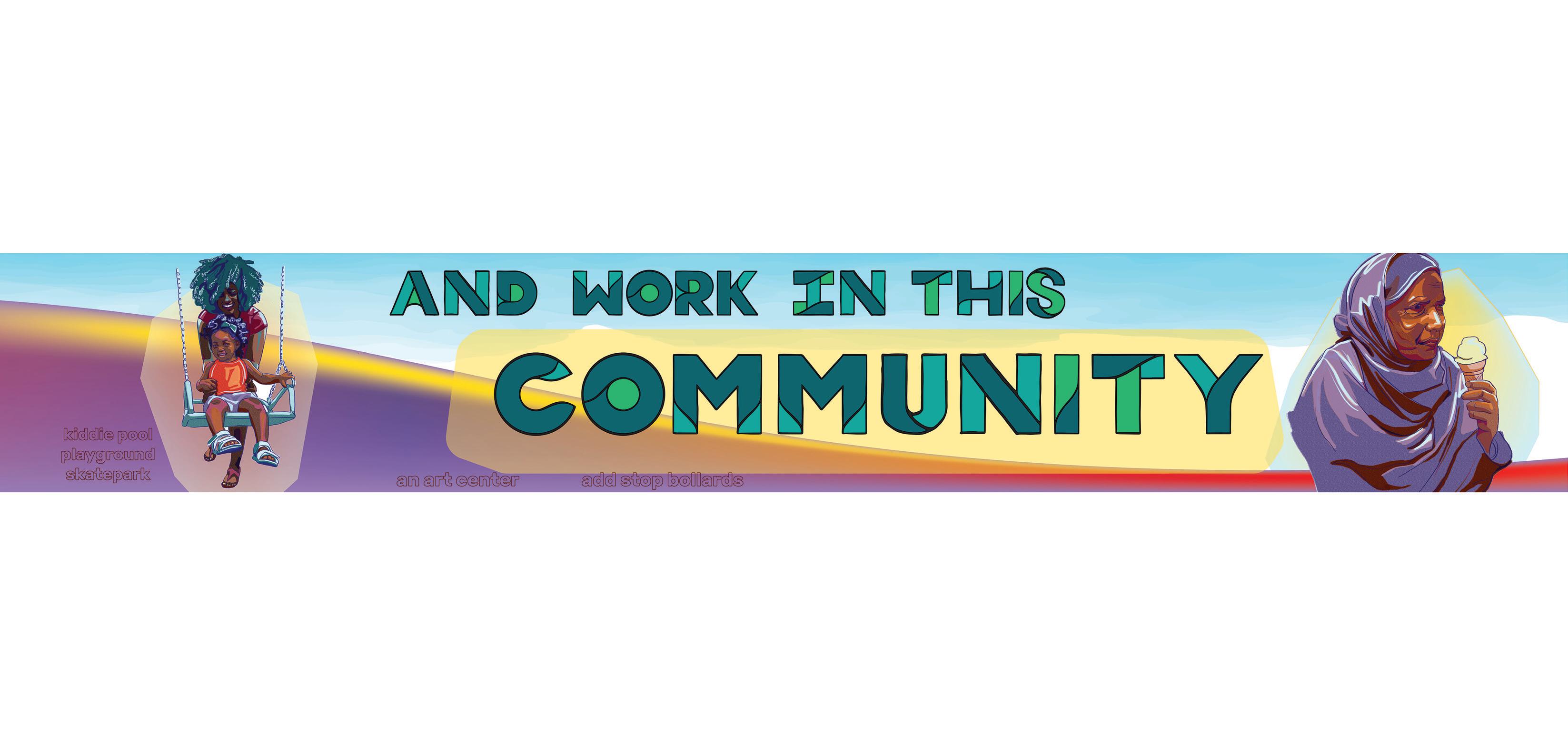 Most of our collective’s artwork features representative gures surrounded by design elements and words that emphasize the “heart message” we hear through our engagement. For this design, we drew nine gures that re ect the di erent communities in the area. We chose to center the question “How do people who live and work in this community have a say in what happens on this site?” Within the limits of our role in this much larger process, we felt it was essential to amplify a message that prompts even further discussion, engagement, and imagination.
