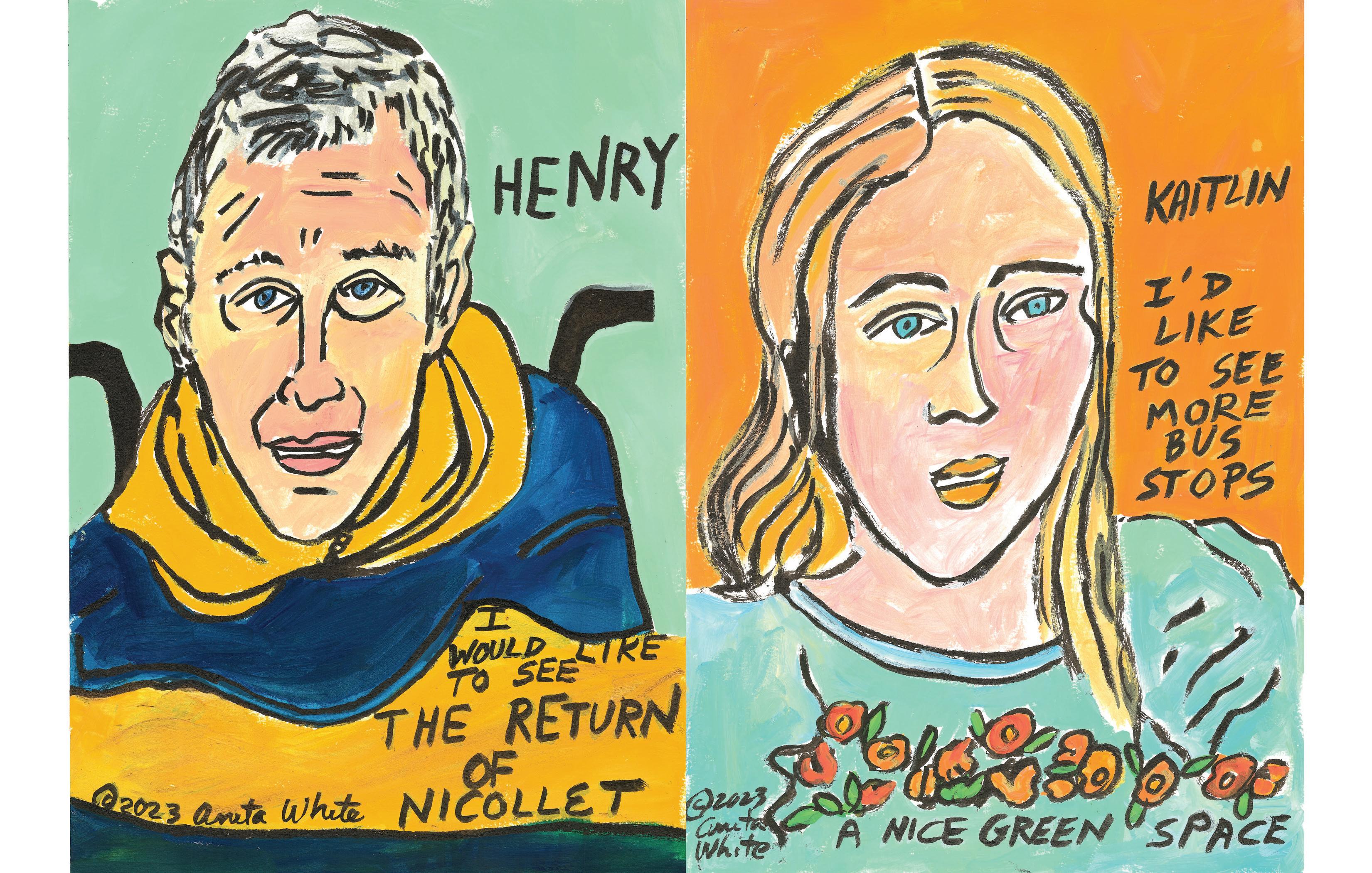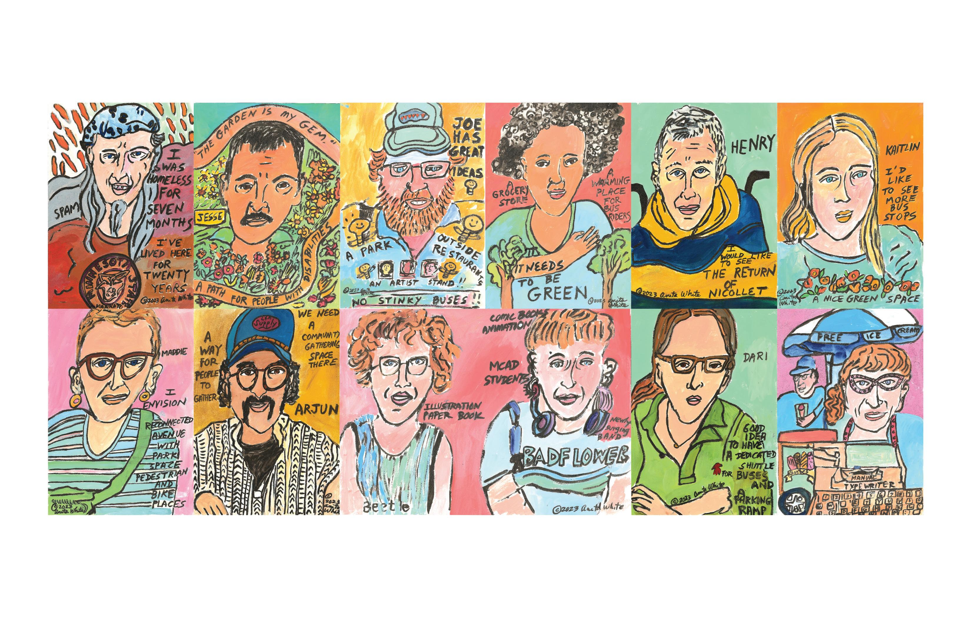 Studio Thalo is an artist collective and studio space made up of Bayou Bay, Olivia Levins Holden, and Nell Pierce. We have worked together as community muralists since 2015, and in 2018 we began to translate those skills into Graphic Recording. As Graphic Recorders, we show up to community conversations and events as listeners and artists, and we create art to capture the heart of what we hear. We incorporate phrases and imagery inspired directly by the people we witness, and we hope for our art to serve as visual reminders and re ections of the values, voices, and visions within a given community. All of us live in South Minneapolis and have been part of public art projects along Lake Street throughout the last decade.