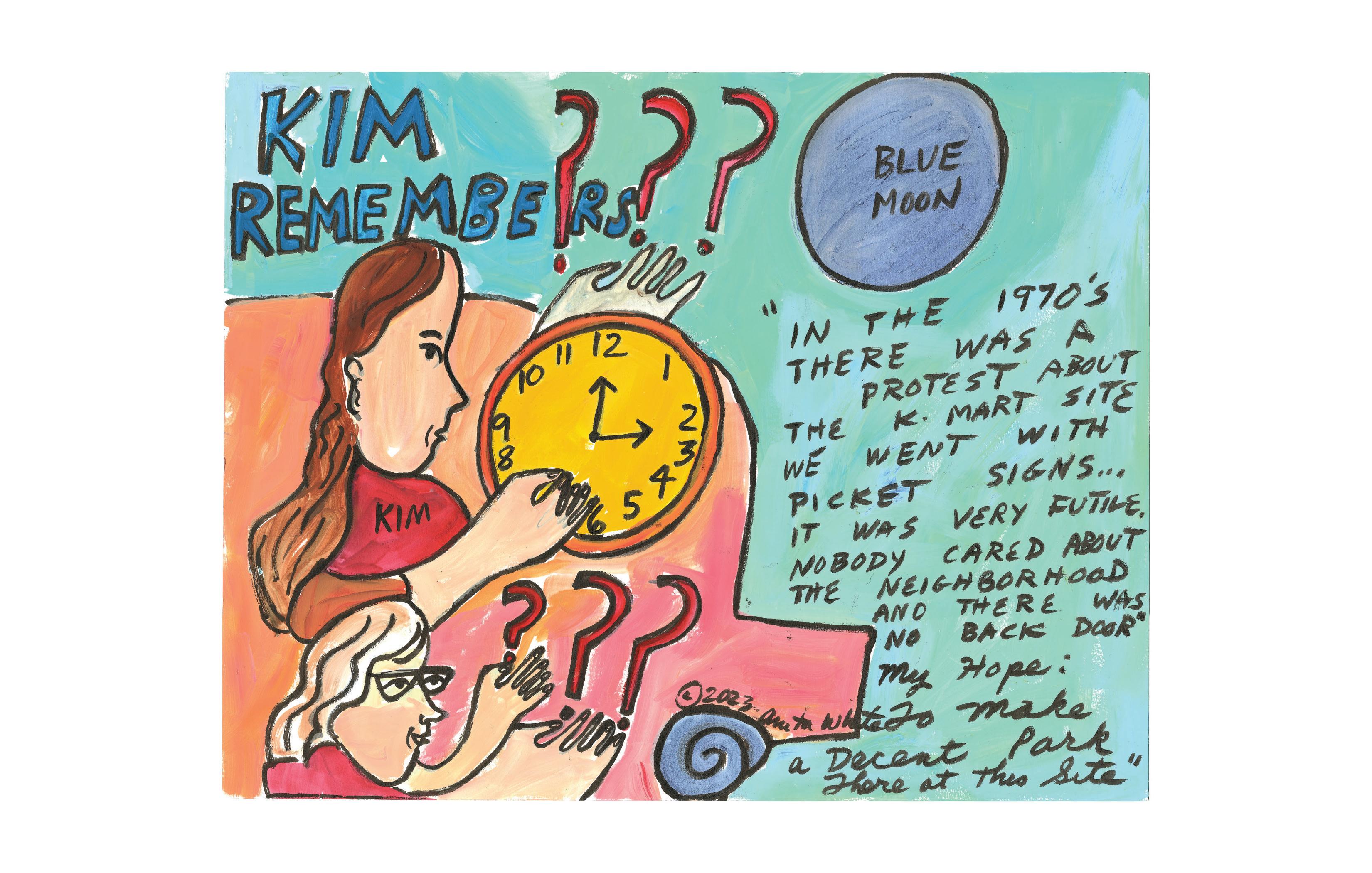 In addition to drawing people directly in the moment, I created two other pieces for this project. A memory piece titled A Pool of Memory about my friend Kim recalling how she and others protested the Kmart Site being put in there in the rst place over 50 years ago. I also did a piece that depicts a large compassionate female gure holding the current desolate Kmart site, the trash, and the Homeless Unhoused Tent Encampment.