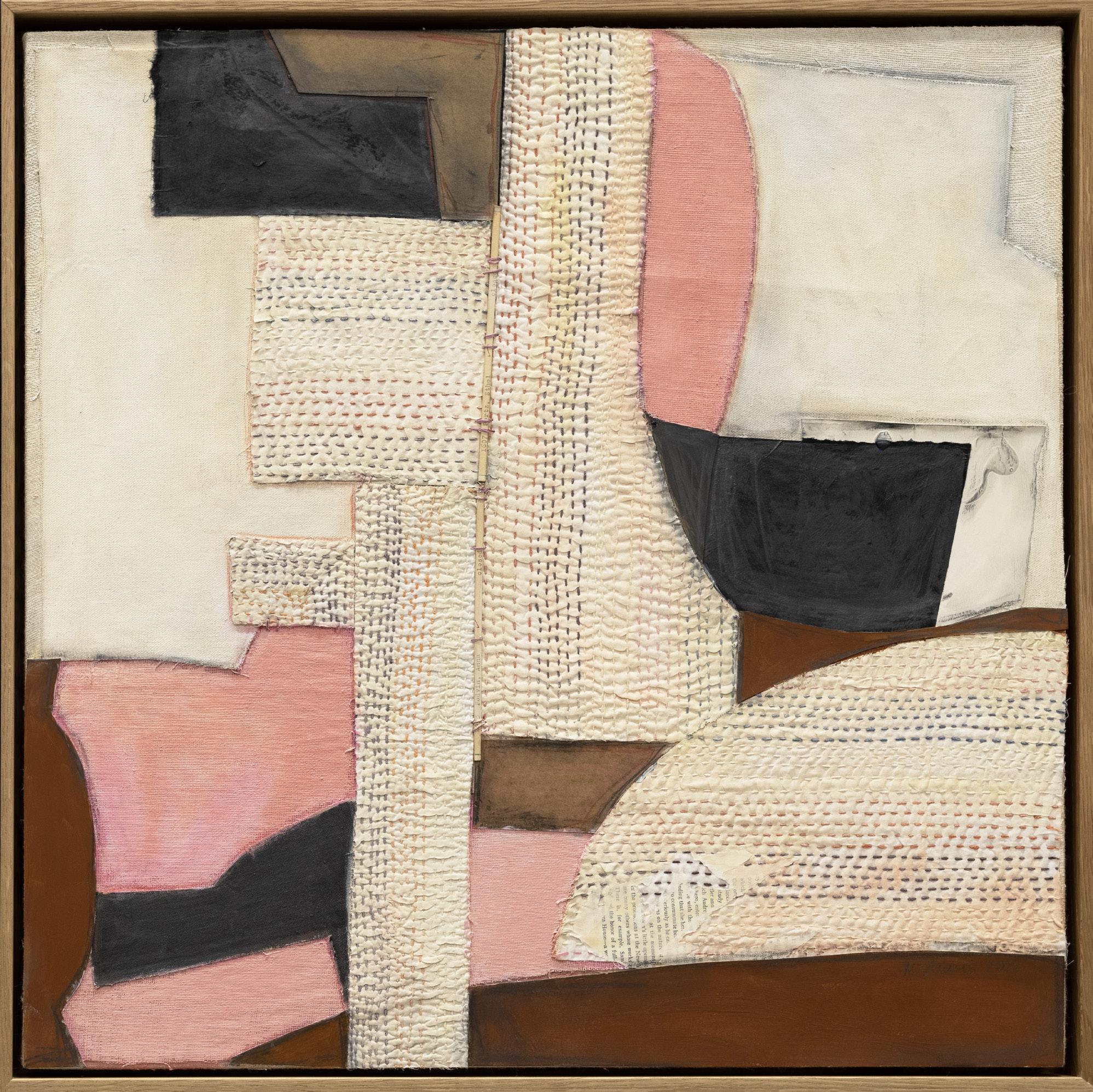 Handmade papers, canvas, hand-stitched vintage Indonesian textiles, and acrylics 24 x 24 in.
