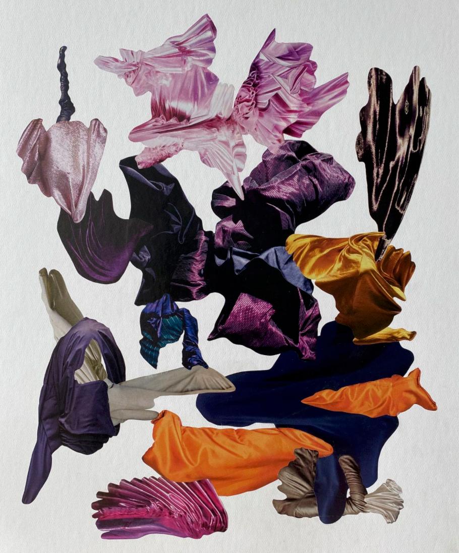 My collage work (sourced from fashion magazines) is a synthesis of my varied interests, such as classical painting, painterly abstraction, street art, haute couture, and the natural world. While I eliminate anything overtly recognizable as a human body, I seek to create an ambiguous sculptural figuration, alien objects defying taxonomic classification that retain the same commodification of desire common to fashion advertising.
