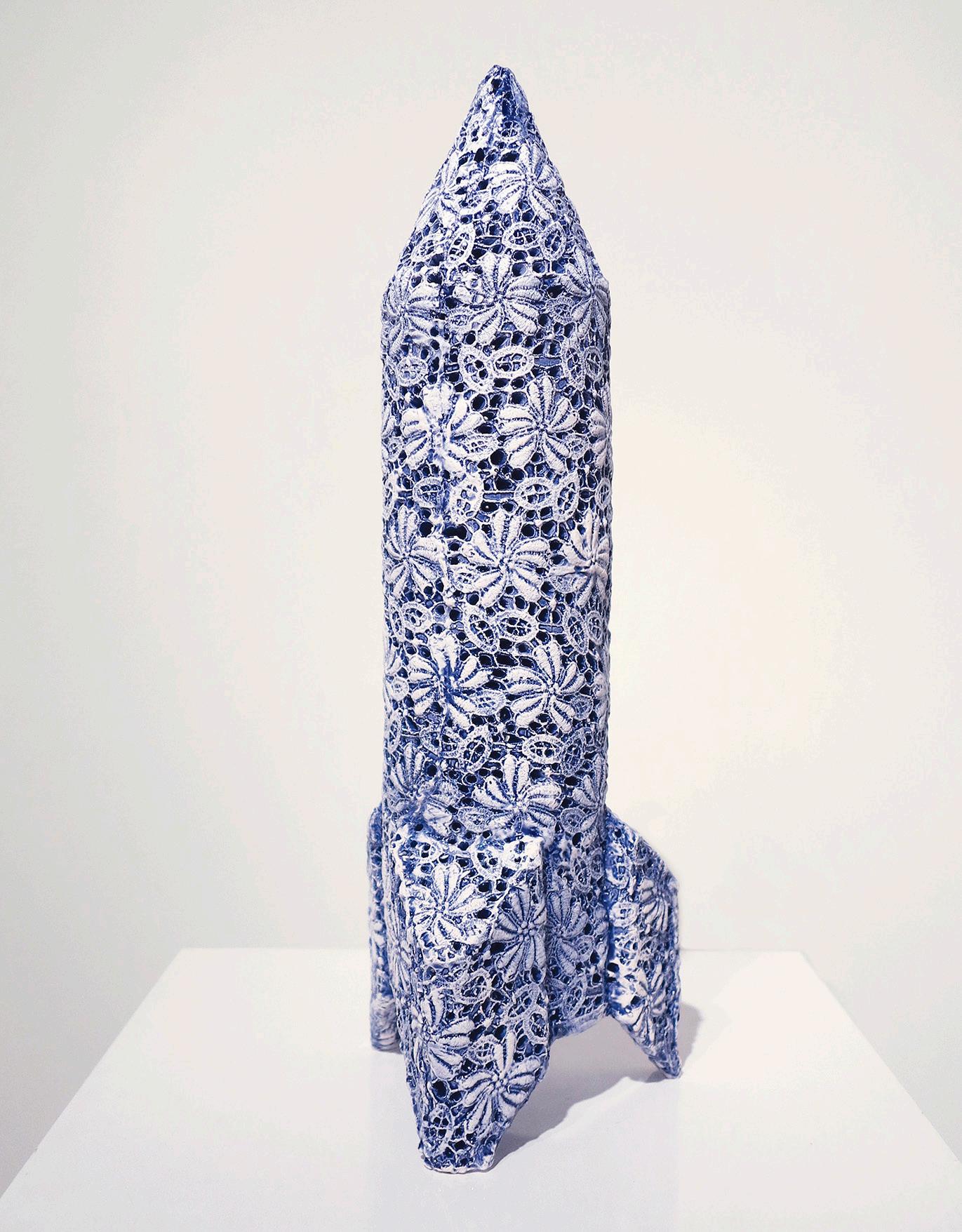 Rocket (A Way to Face the Sky) is a work full of contradiction. Like other works in this series, the rocket form combined with lace and porcelain material expresses the contrasting relationships between strength and vulnerability, beauty and fallibility. As the form is called into question, is it also imbued with another kind of power? What seems at odds is truly reflective of how our daily lives are filled with fleeting experiences of the poetic and complicated.