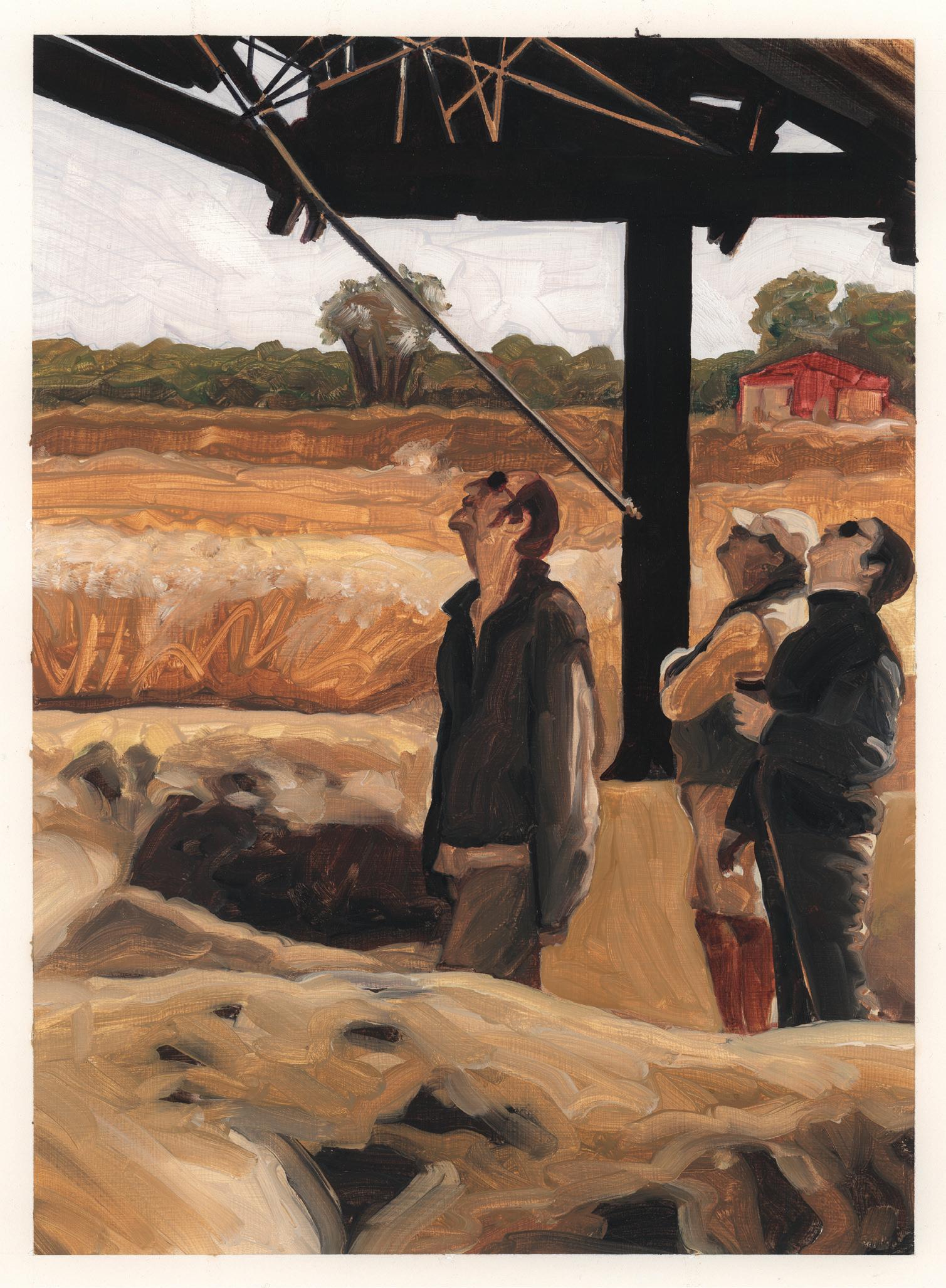 Writers are always advised “to write what you know,” so I claimed that for myself, “to paint what I know.” And I spend a good deal of time looking at art and observing others doing the same. This piece is part of my ongoing series Looking at Art, and these folks are at the Franconia Sculpture Park.