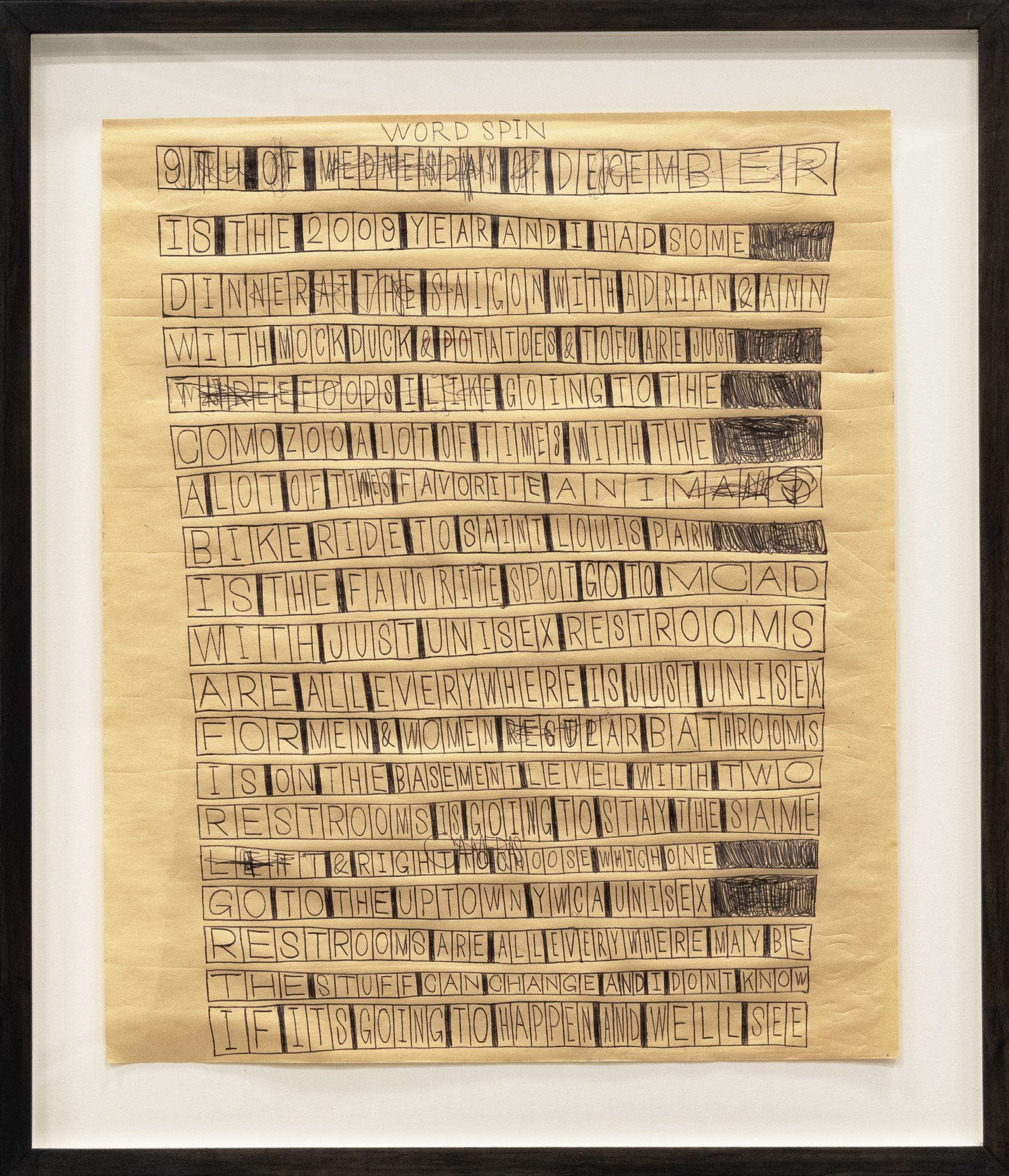As an artist with autism, Sieling’s work reflects his dynamic and sometimes chaotic take on the world. This is a particularly fine work, depicting the artist’s train of thought about his day, eating Mock Duck at Saigon Cafe, his love of the Como Zoo, and Unisex restrooms at MCAD. Expressive and full of crossed-out areas, it is a direct imprint of a mind at work.