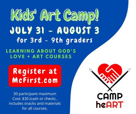 Our Children’s Ministry is excited to share that we will be hosting an art camp. Camp heART will take place July 31st- August 3rd from 8:30 AM- 12:30PM. Camp heART offers children from 3rd grade- 9th grade the opportunity to be instructed in a variety of art forms, music, painting, crochet, creative writing, jewelry making, and culinary arts. Each day begins with a devotional about God’s love and the importance of serving others. Students will attend three art courses daily where they will be encouraged to explore their creative side and develop their artistic talents.