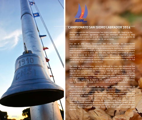 CAMPEONATO SAN ISIDRO LABRADOR 2014 Una nueva edición del Campeonato San Isidro Labrador -SIL- llegó a su fin. Desde ya queremos agradecer todos los mensajes recibidos y muy especialmente a todos los que de una manera u otra pusieron su granito de arena para convertir esta edición del SIL en un éxito. Fue en el año 2010, Centenario del Club, cuando las autoridades decidieron darle un impulso al campeonato, que ya era una fecha establecida en el calendario nacional, pero no tenía la convocatoria masiva de estos últimos años. El desafío era convertir al SIL en un evento clave del calendario nacional e internacional y poco a poco, año tras año, nos fuimos acercando al objetivo. Con la ayuda de marineros y empleados, oficiales de regatas y jueces, voluntarios y colaboradores, socios e invitados, deportistas y entrenadores; y con el apoyo inestimable de nuestros patrocinadores, el escenario del SIL fue cambiando. Y el esfuerzo dio sus frutos. Del total de 740 inscriptos, como es habitual la clase más numerosa fue Optimist, que en este caso podría decirse que tuvo récord de asistencia, con más de 200 competidores en Timoneles y más de 160 en Principiantes. Le siguieron en número las tres categorías de Laser, con 87 inscriptos en Radial, 29 y 33 en 4.7 y Standard respectivamente. Las otras clases tuvieron: Snipe, 25 competidores; 420, 22; 29er, 20; Cadet, 19; Grumete, 18; Soling, 17; RS:X, 12; F18, 10; Lightning, 9; Techno 293, 9 (entre principiantes y avanzados); Star, 9; Raceboard, 7; S33od, 5; OD 27, 5; 2.4m, 4; y Vela Adaptada, 3. Cabe destacar que muchas de las clases confiaron en nosotros la organización de sus campeonatos selectivos, que definen a las tripulaciones que representarán al país en eventos internacionales de primera categoría, lo cual es una prueba del alto nivel competitivo del torneo; corroborado además por la presencia de deportistas de primer nivel como Dante Cittadini, flamante campeón sudamericano de Optimist 2014, Matías Paillot y Juan Fernández Ocampo, representantes olímpicos de la clase 2.4m; Tiago Brito y Andrei Kneipp, de Brasil, medalla de oro en el campeonato mundial juvenil de 420 de la ISAF y subcampeones mundiales de la clase; y Bautista Saubidet Birkner, medalla de bronce en el Mundial Juvenil de RS:X; para mencionar sólo algunos.
