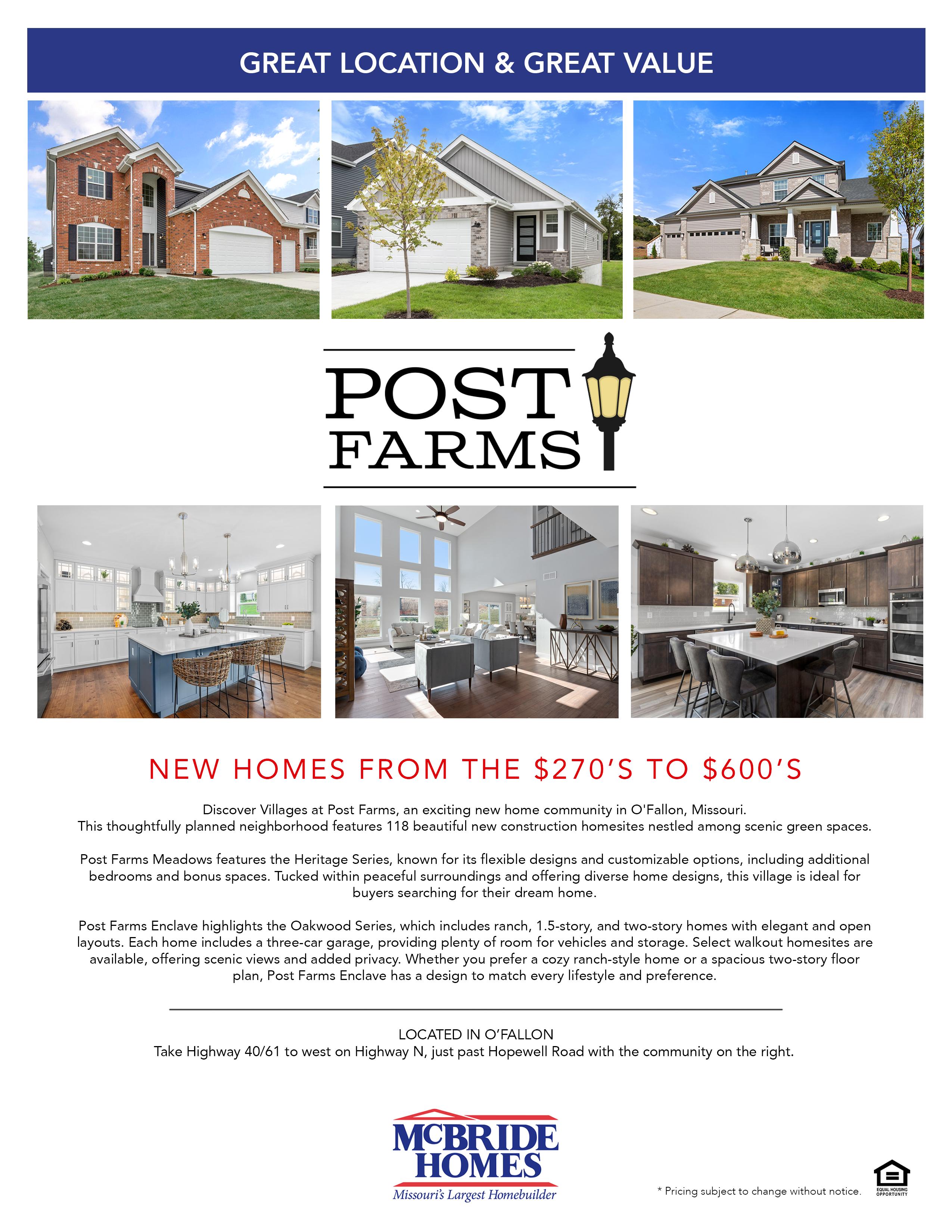 For more information regarding price at the Meadows, please contact Tony Weber Call (636) 534-1420 or email tweber@mcbridehomes.com