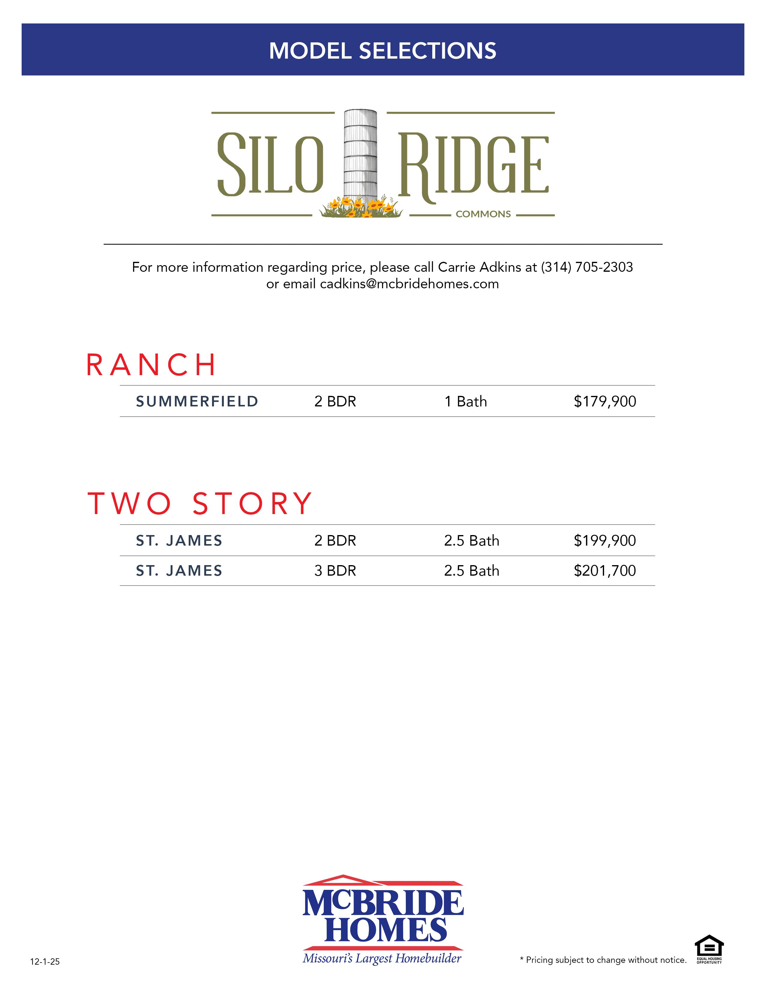 For more information regarding price, please contact Monica Carroll Call (314) 705-2303 or email cadkins@mcbridehomes.com