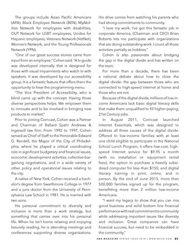 His drive comes from watching his parents who had strong commitments to community. “I love my work. I’ve got this fantastic job in corporate America. (Chairman and CEO) Brian Roberts lets me participate with organizations that are doing outstanding work. I count all those activities partially as hobbies.” Cohen is also passionate about bridging the gap in the digital divide and has written on the topic. For more than a decade, there has been a national debate about how to close the digital divide: the gap between those who are connected to high-speed Internet at home and those who are not. Because of the digital divide, millions of low-income Americans lack basic digital literacy skills that make them unqualified to fill higher-paying, 21st Century jobs. In August 2011, Comcast launched Internet Essentials, which was designed to address all three causes of the digital divide. Offered to low-income families with at least one child eligible to participate in the National School Lunch Program, it offers low-cost, highspeed Internet service for $9.95 a month (with no installation or equipment rental fees), the option to purchase a heavily subsidized computer for less than $150, and digital literacy training in print, online, and in person. By the end of June 2015, more than 500,000 families signed up for the program, benefitting more than 2 million low-income Americans. “I want my legacy to show that you can mix good business and solid bottom line financial performance with real commitment to community while addressing important issues like diversity and inclusion. Great companies can have financial success, but need to be embedded in the community.” DD && B BMM AA GG AA Z IZNI N E ES PS R P IRNI N G GI SI SS U SU E E2 02 10 81 8| |WW WW WW .M .M CCC AA . C. C OO MM