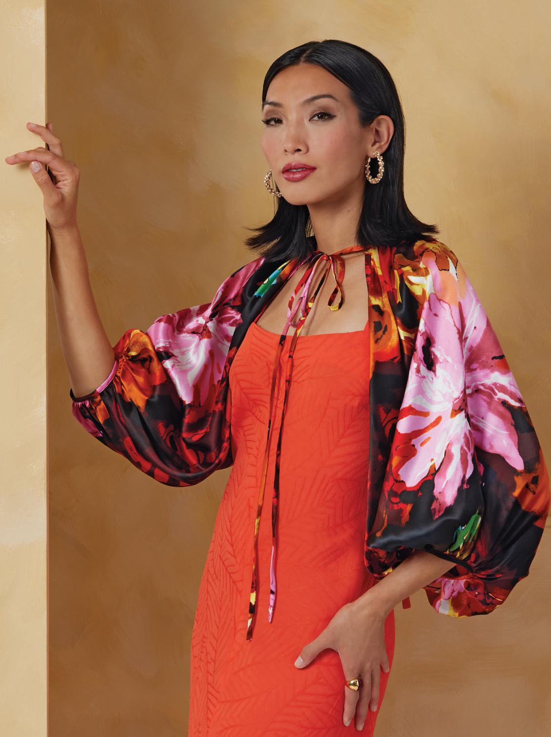 V2073 Jacket. Earrings & ring: Betty Carre. Handbag: Sondra Roberts.