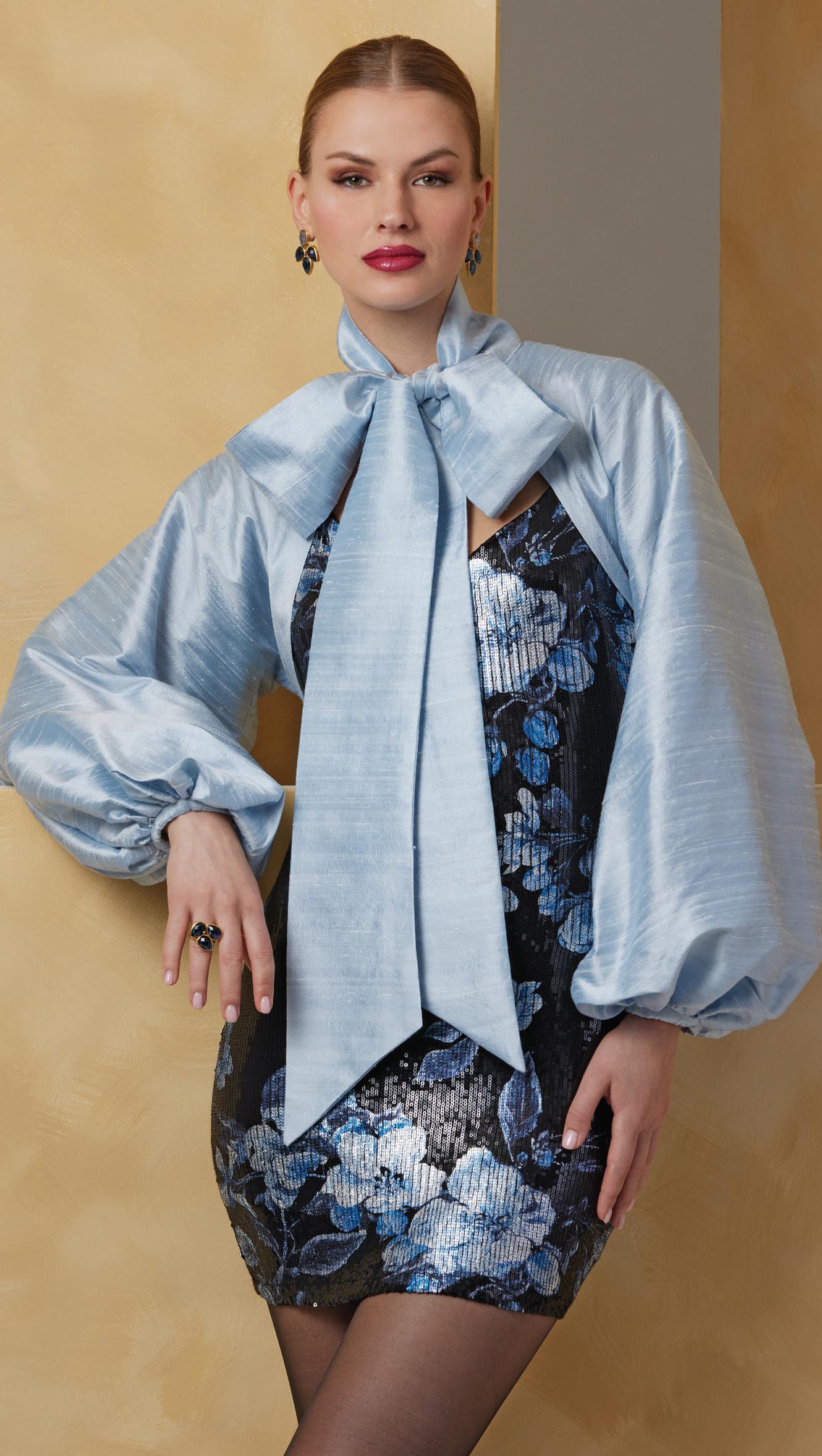 V2079 Powder blue jacket. Earrings & ring: Betty Carre.