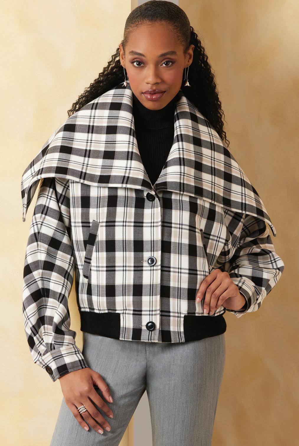 V2072 Plaid jacket. Earrings: Jenny Walker.