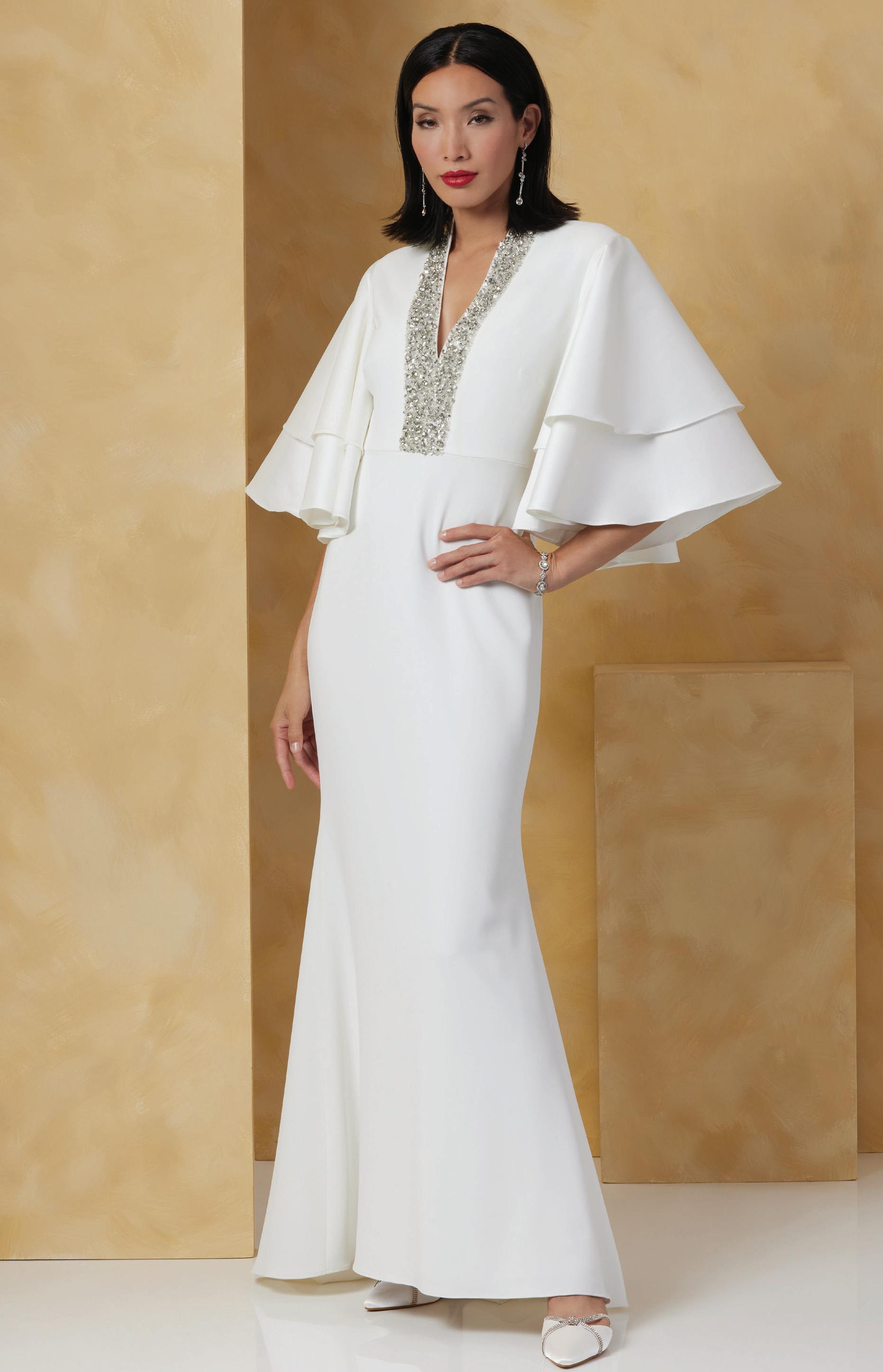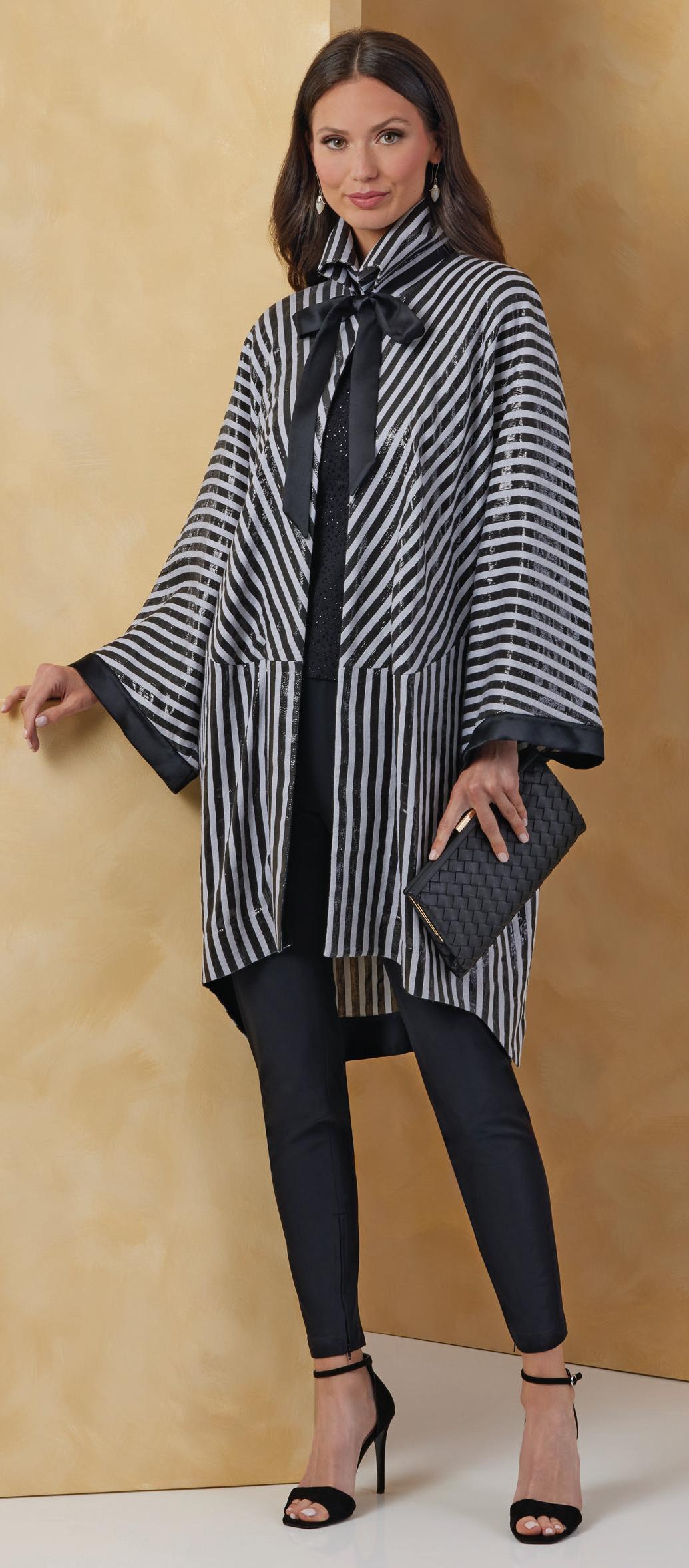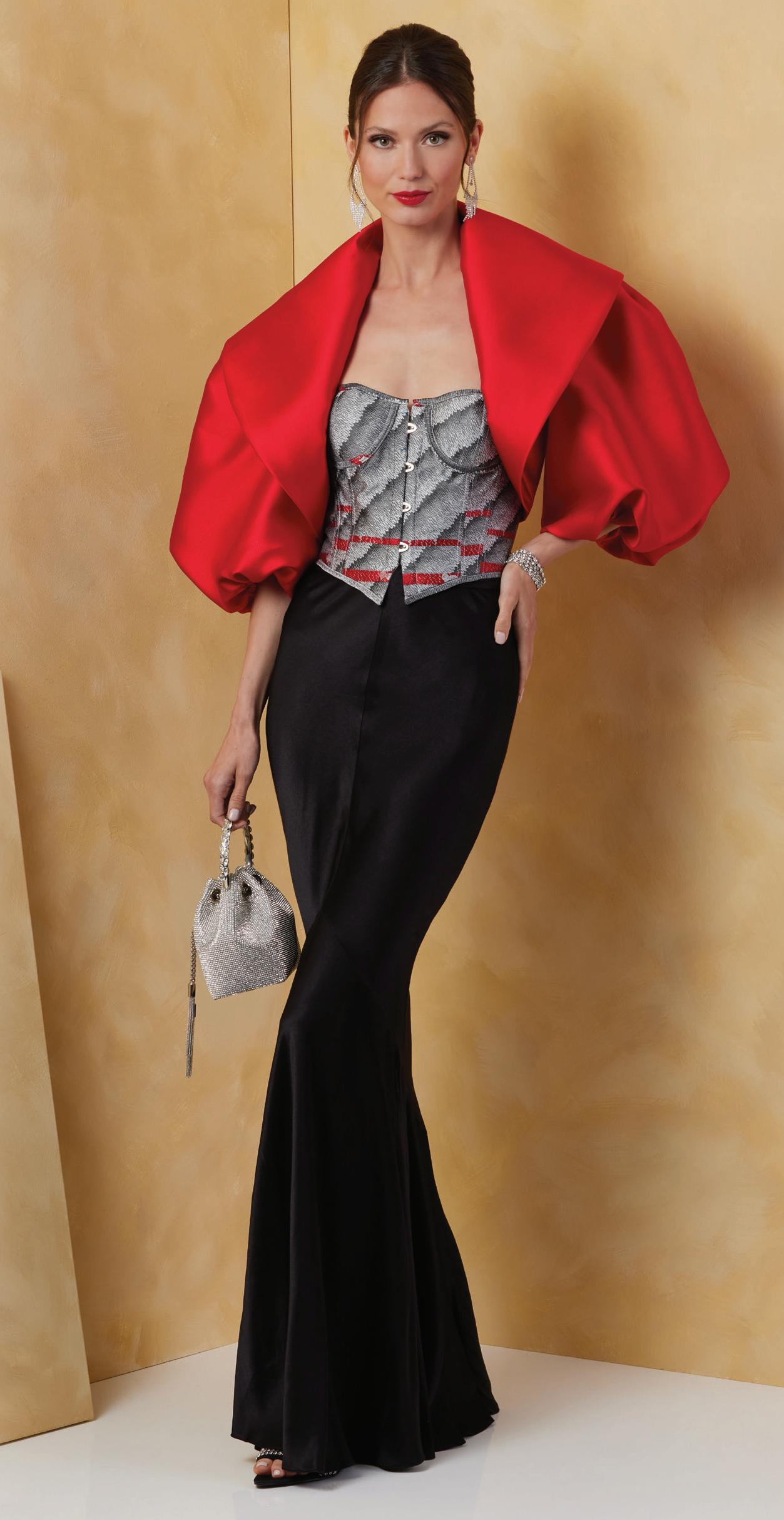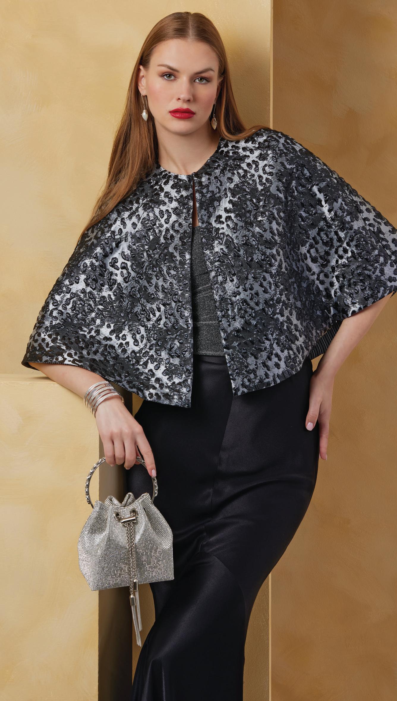 V2078 Silver/black capelet. Earrings: Jenny Walker. Handbag: Sondra Roberts.