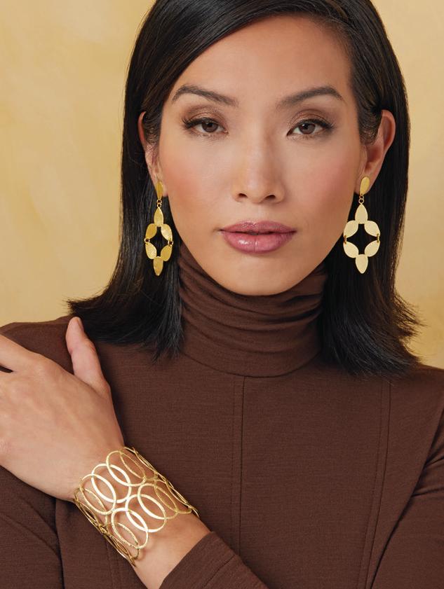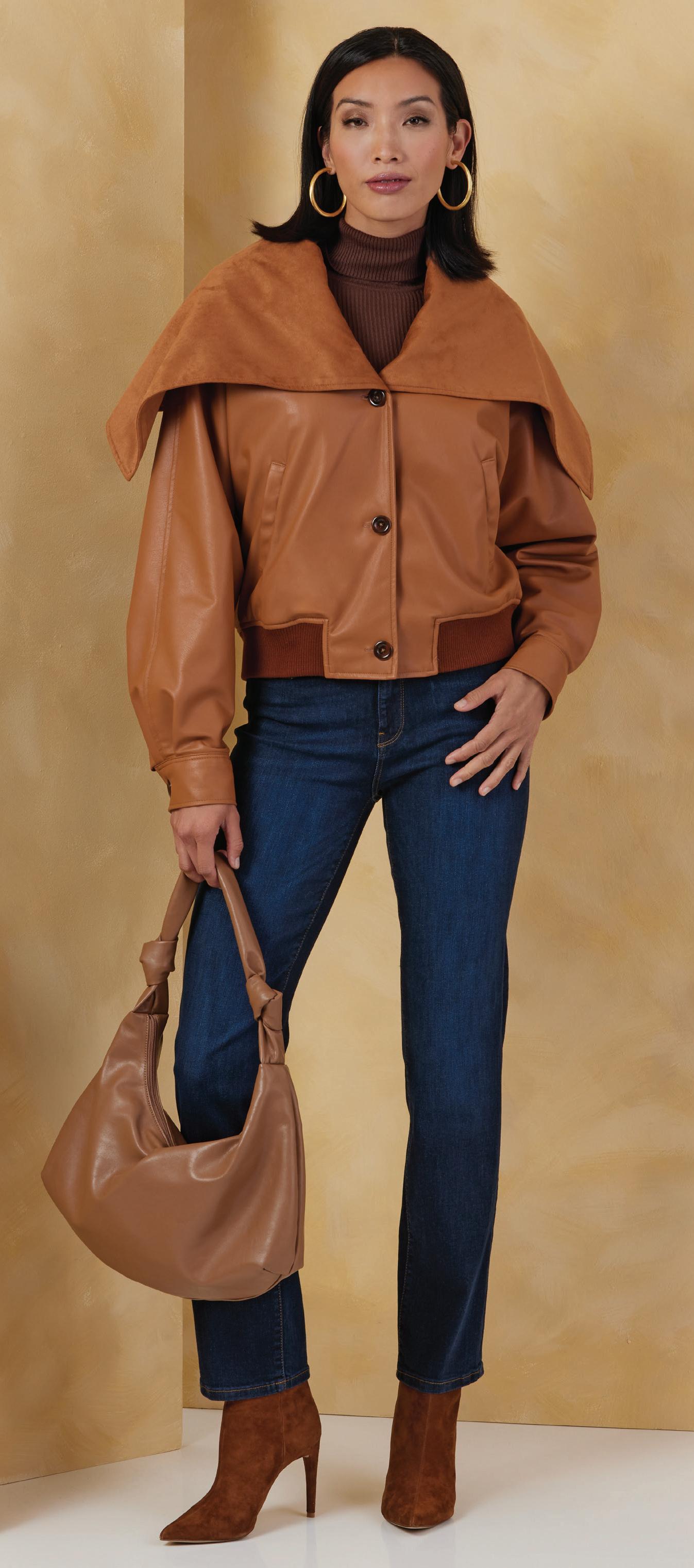 V2072 Tan jacket. Earrings: Betty Carre. Handbag: Sondra Roberts.