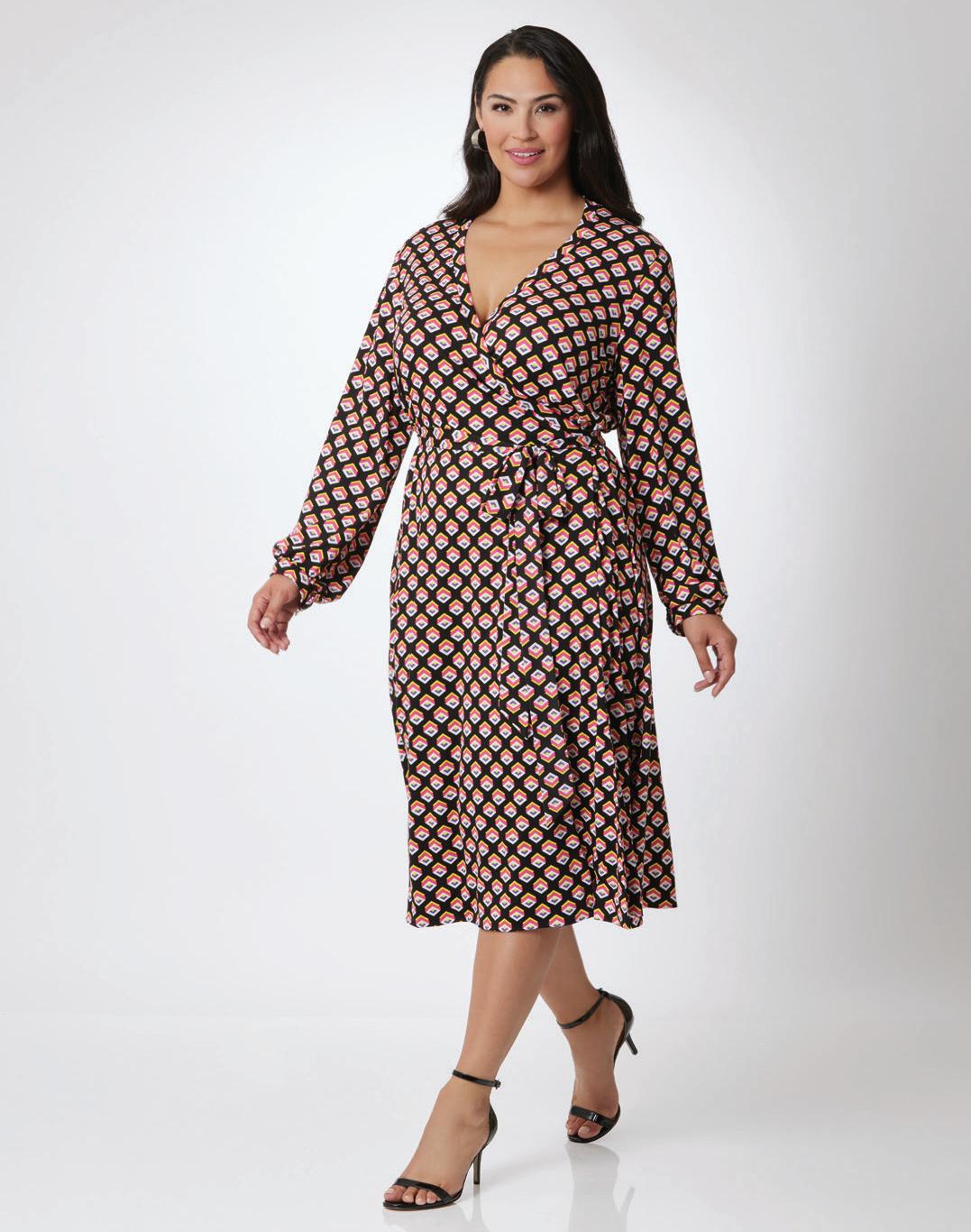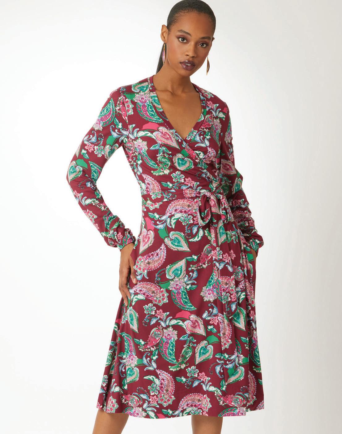 V2081 Burgundy print dress. Earrings: Jenny Walker.