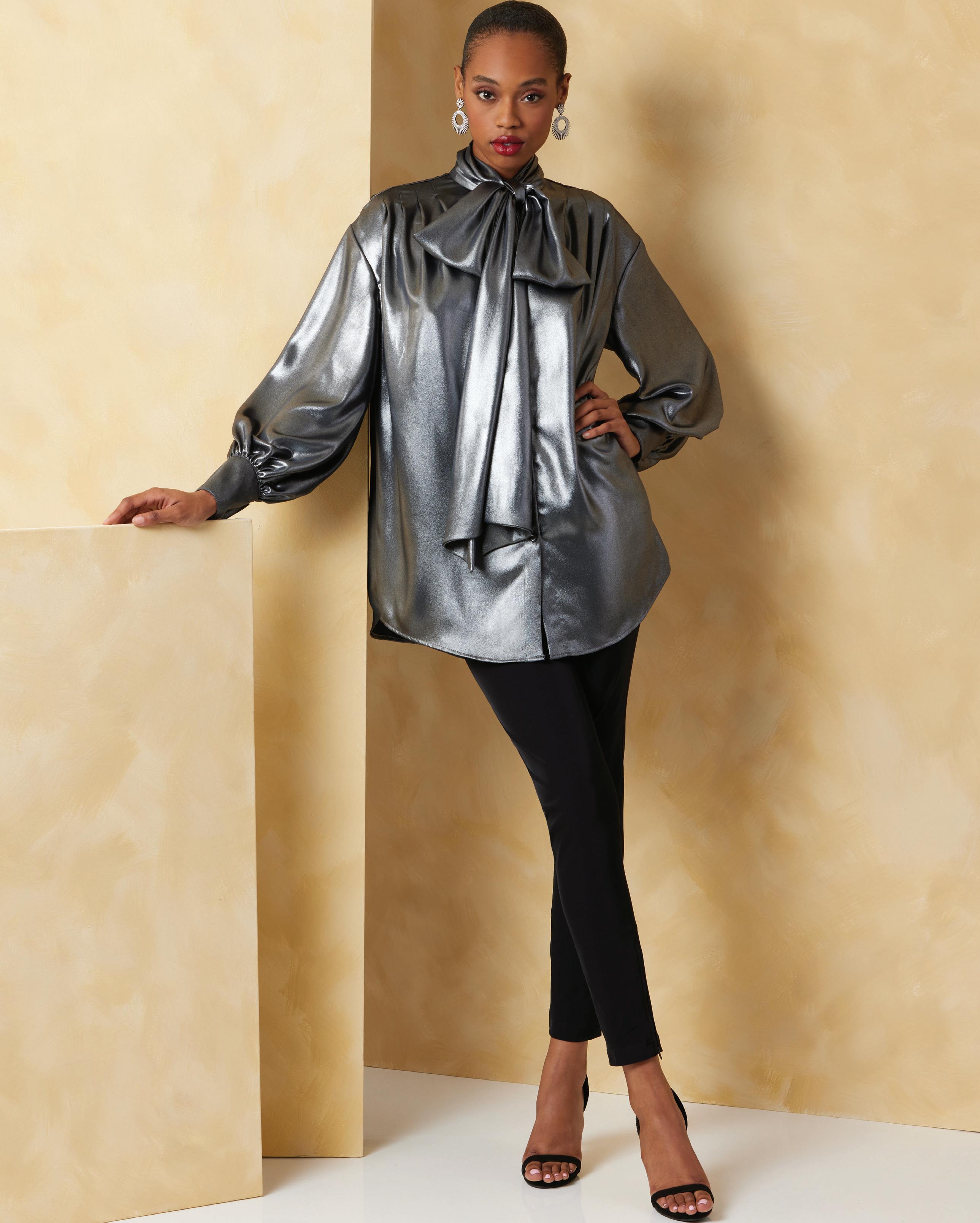 V2068 White blouse. Earrings & ring: Betty Carre. Handbag: Sondra Roberts.