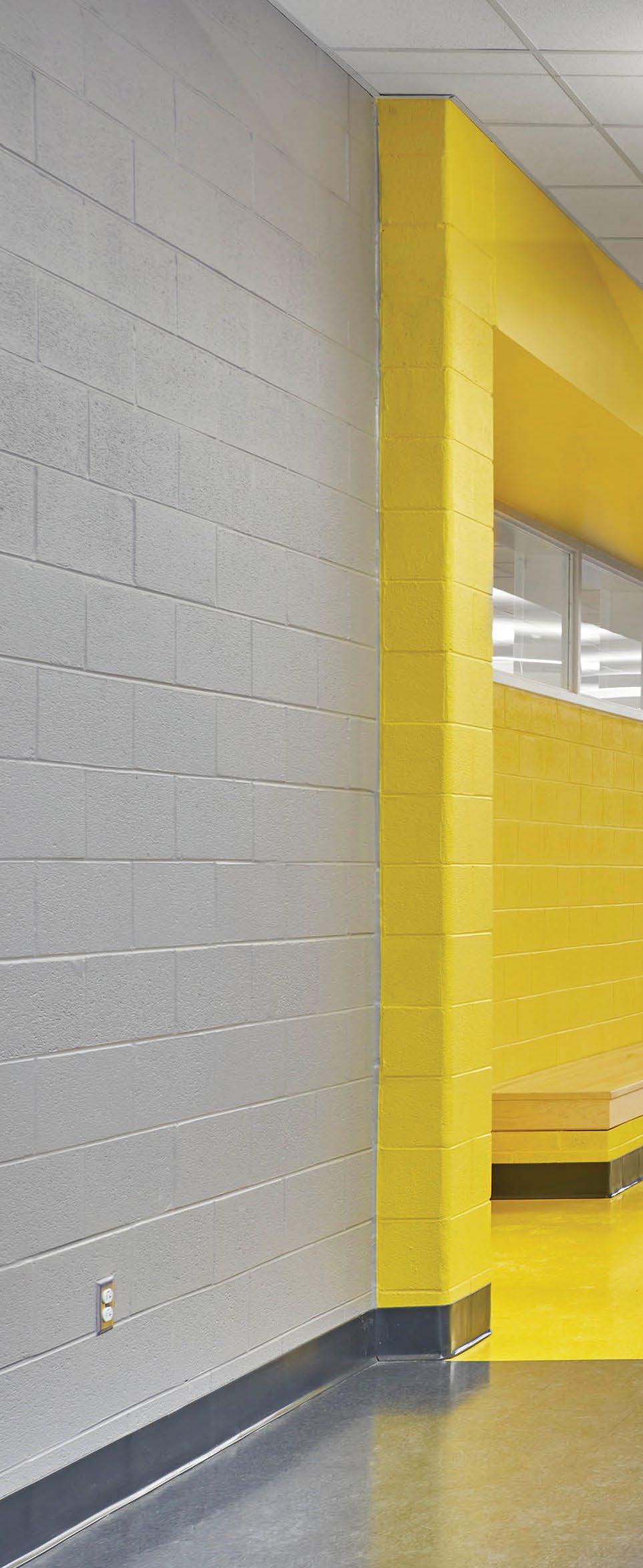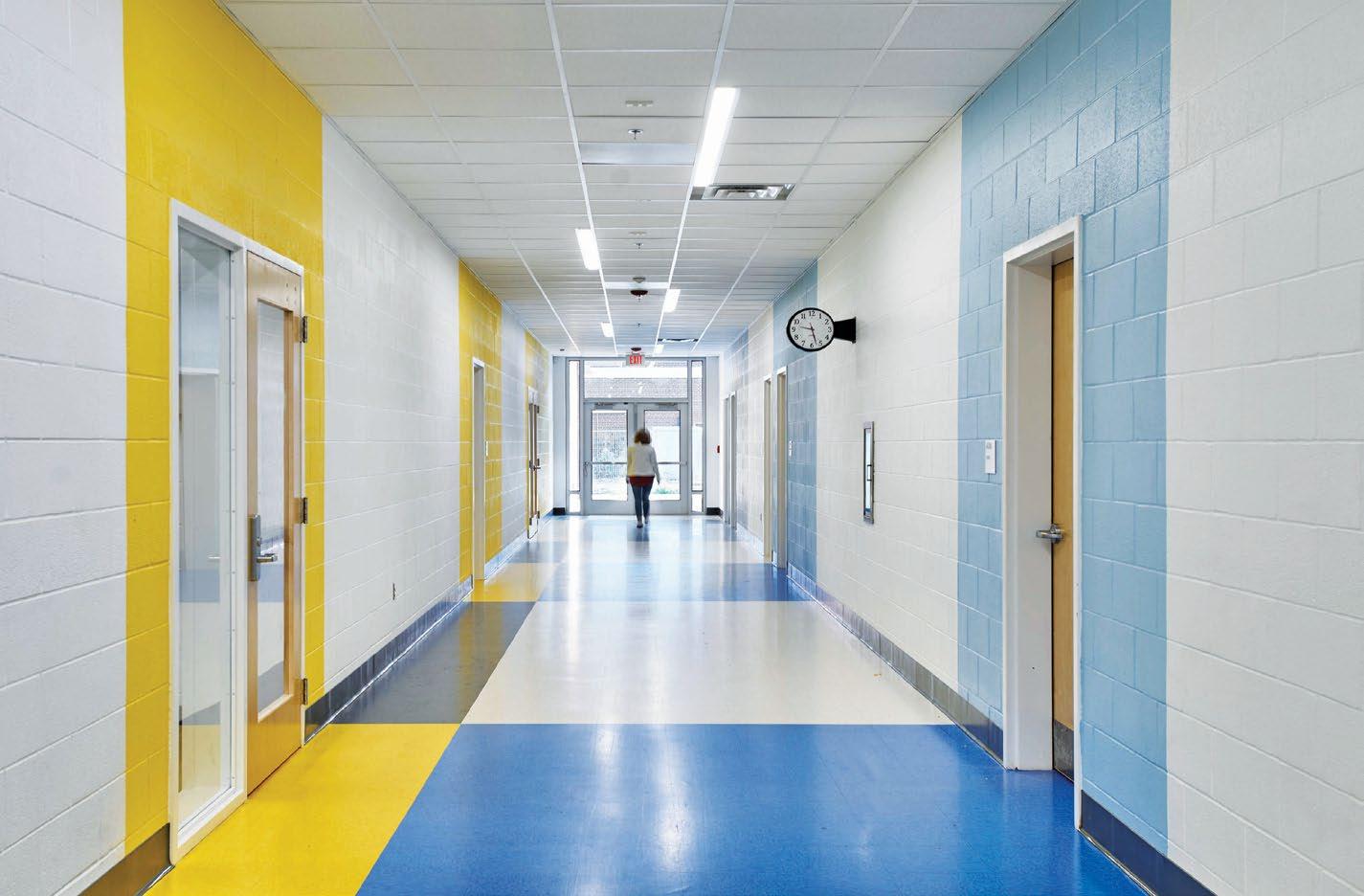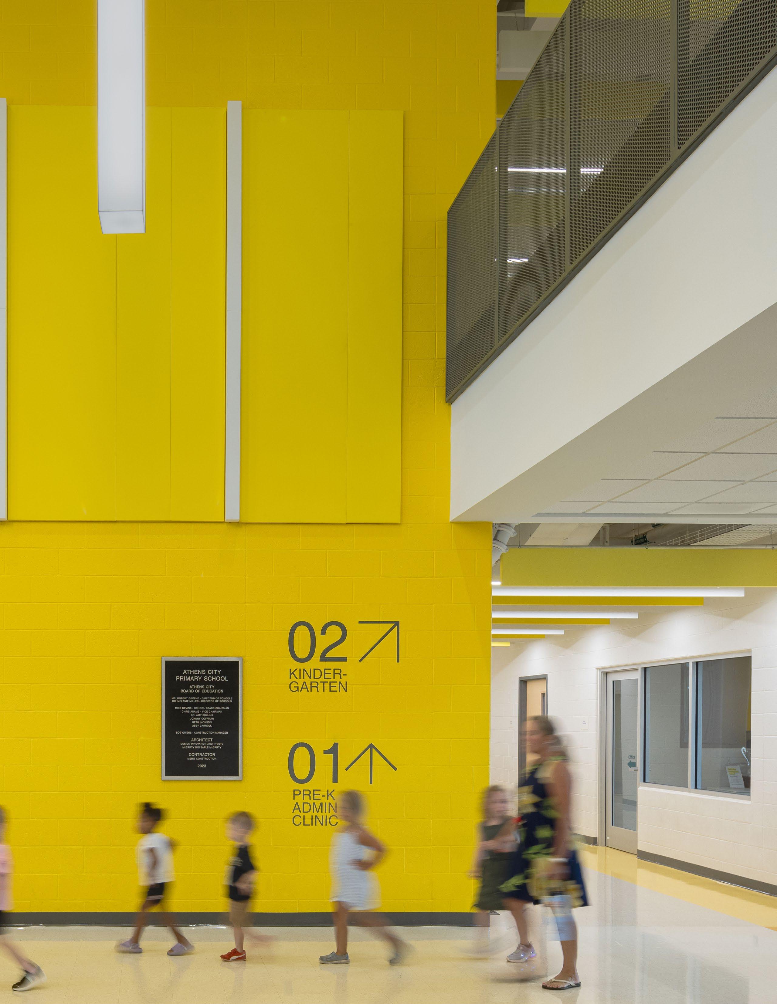 School colors are creatively integrated into the interiors, aiding wayfinding and highlighting functional zones throughout the building.