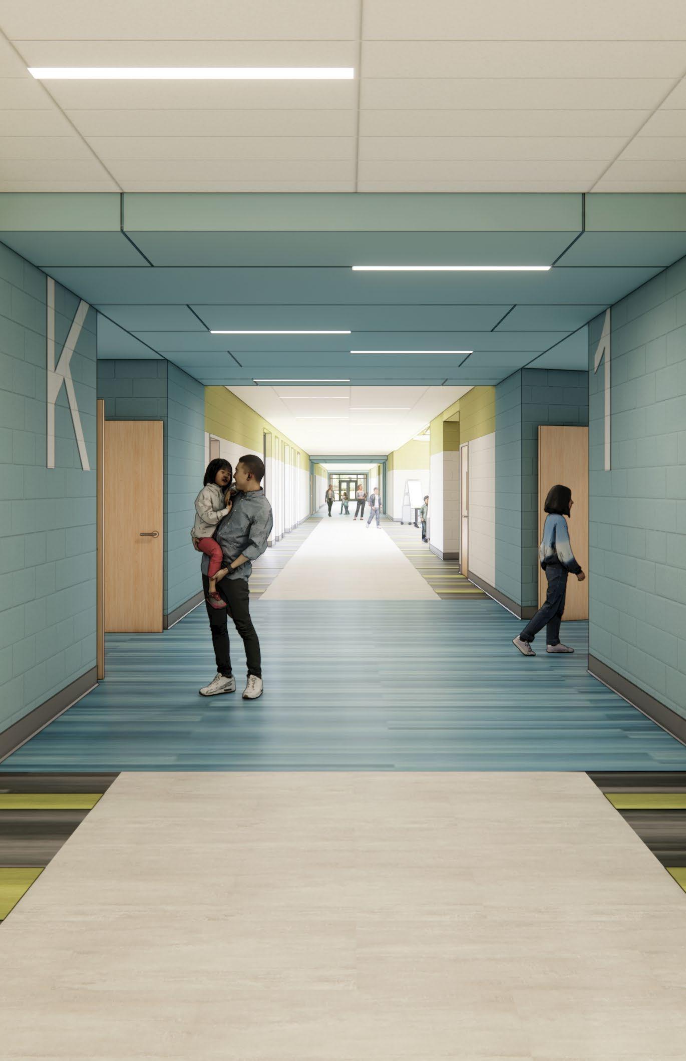 The design of the new facility implements strategies for enhancing daylight and opportunities to connect with the outdoors — whether it is visually through large windows in classrooms and corridors or physically with a multipurpose courtyard that can be used for outdoor classrooms.