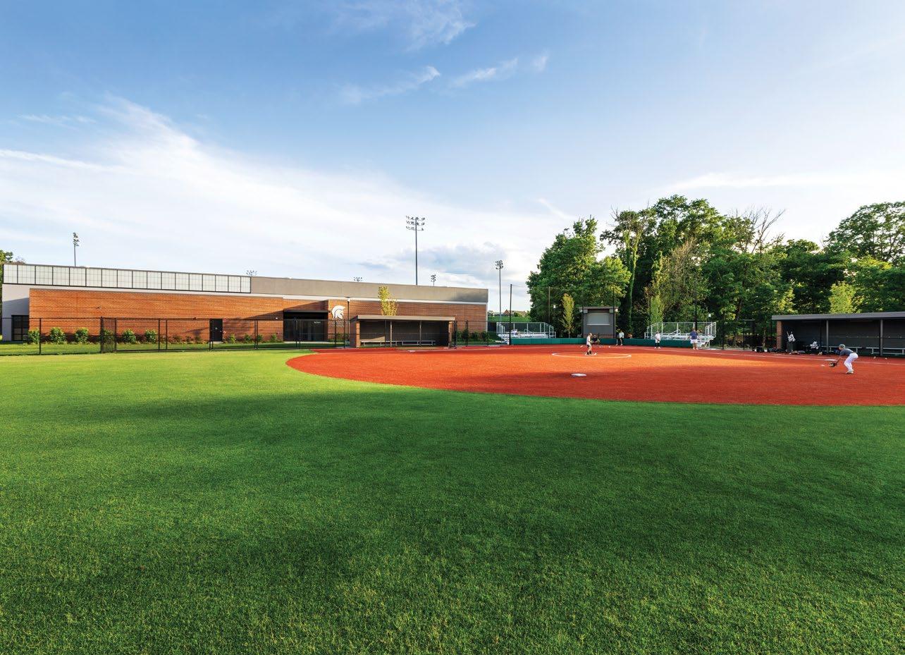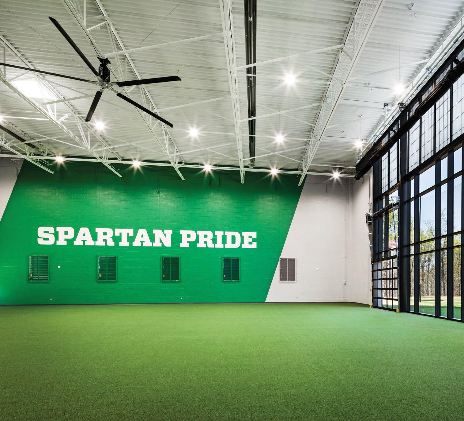 The Clark Wormsley Hitting & Pitching Complex features an indoor practice area with two full-length bullpen tunnels and two hitting tunnels in a high-bay space.