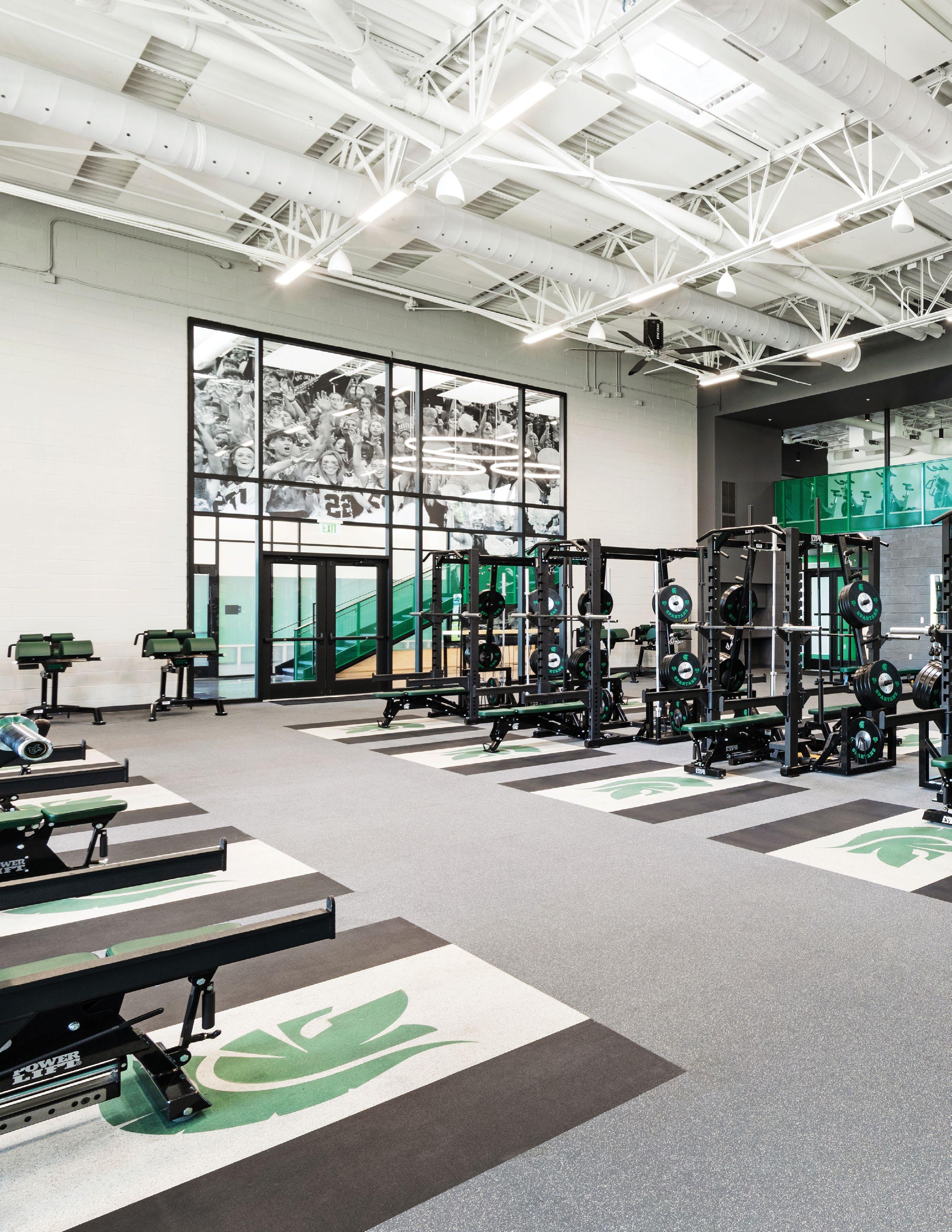 Branding is prominently featured throughout the building, reinforcing the athletic theme with super graphics and bold statements that inspire a sense of community and teamwork.