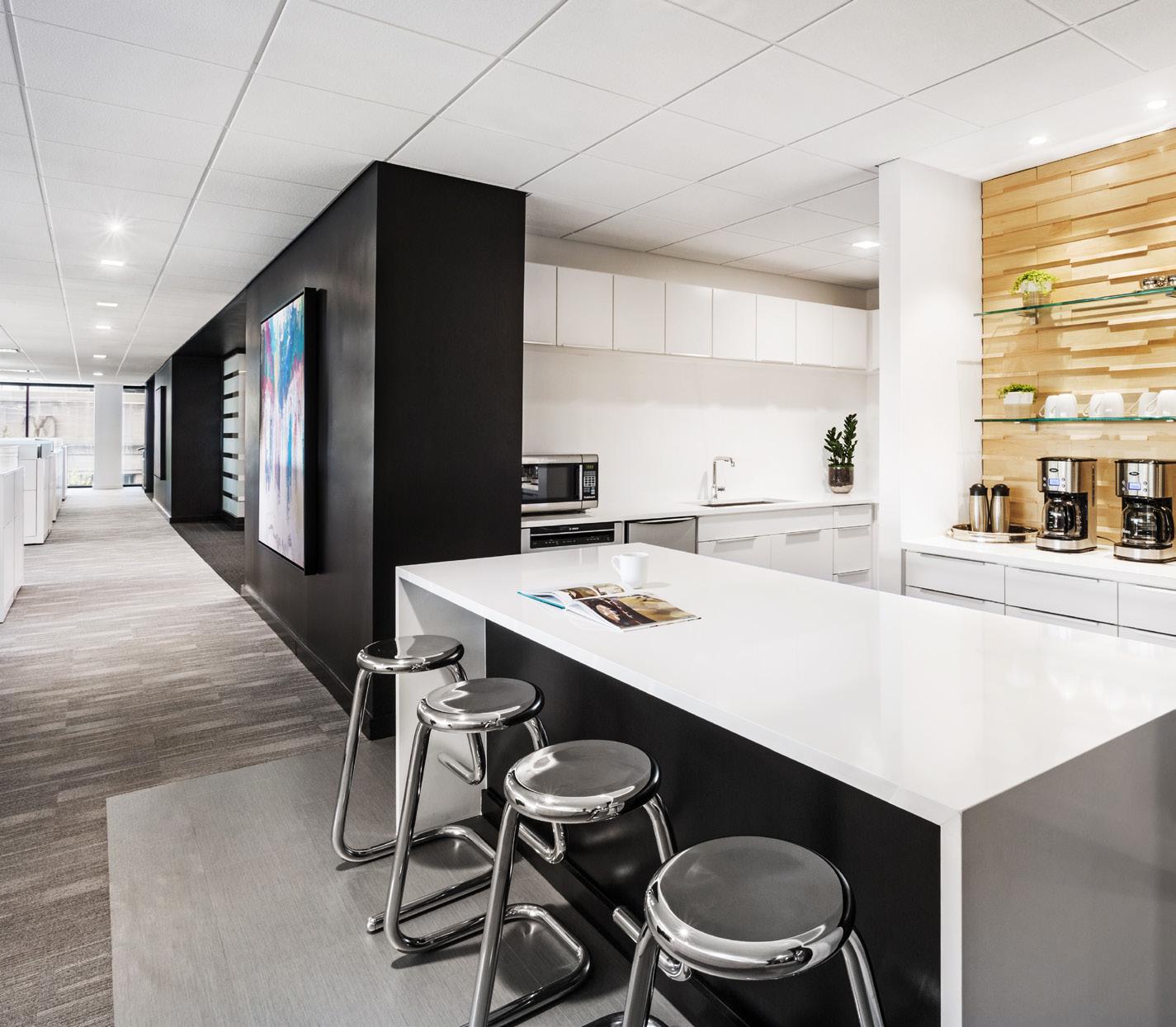MHM’s office renovation transformed a dark, enclosed space into an open, light-filled environment that fosters collaboration. A black and white theme with warm maple accents and optimized workstation orientation enhances natural light and views.