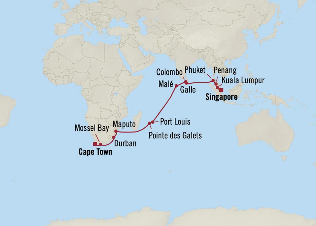 Erleben Sie eine aussergewöhnliche Seereise, die zwei faszinierende Kontinente und die Wunder des Indischen Ozeans miteinander verbindet. Diese Kreuzfahrt entführt Sie von den weiten Landschaften des südlichen Afrikas bis in die exotische Vielfalt Südostasiens – eine Route voller Kontraste, Kulturen und Entdeckungen.
