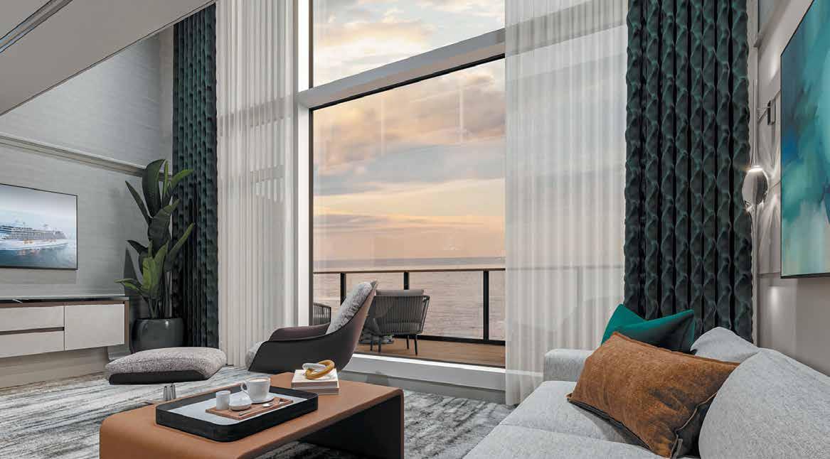 The Skyview Aura, Luna and Sola Suites are three distinct expressions of the same exclusive category — each with its own layout, character and connection. Though each suite has its own personality, all share the same elevated experience: private second-floor Skyview terraces with shaded areas and jetted tubs, in-suite elevators and access to Deck 15 reserved for only six Skyview Suites and the Skyview Regent Suite.