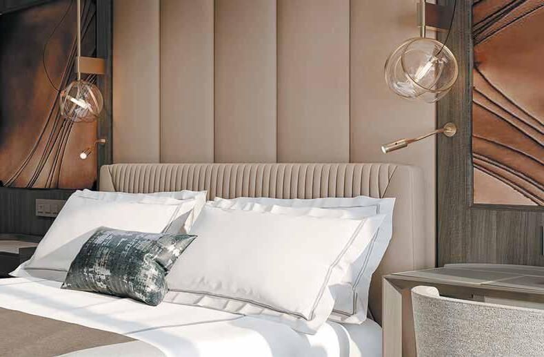 As a traveller who appreciates luxurious style and space, your Grand Suite blends an expansive atmosphere with mid-century inspired furniture and a refined palette of neutrals accented by soft greens. Italian craftsmanship shines through in the details — textured fabrics, woven leather accents and mosaic-tiled bathrooms featuring plaid patterns and pencil-thin designs behind the sinks. Bedrooms are thoughtfully designed with double headboards, upholstered side panels and retractable TVs for added comfort.