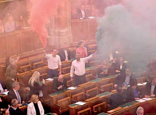 Bár az újkori magyar demokráciában az Országház falai között még nem láthattunk a szerb vagy az ukrán parlamentben lezajlóhoz hasonló, tettlegességig fajuló jeleneteket, egyre durvább eszközökhöz nyúlnak a képviselők, ha nemtetszésüknek akarnak hangot adni az Országgyűlésben. A Momentum politikusai a gyülekezési törvény módosítása ellen tiltakoztak úgy, hogy több füstgyertyát meggyújtottak az ülésteremben, a független Hadházy Ákossal szórólapokat dobáltak és a szovjet himnusz játszották. Az ülést a szavazás után egy időre felfüggesztették, mert ki kellett szellőztetni a termet; a koronavírus-fertőzése idején a klinikai halálból visszahozott fideszes képviselő, Bányai Gábor sürgős orvosi ellátást kapott. Az akciónak súlyos bírság és kitiltás lett a