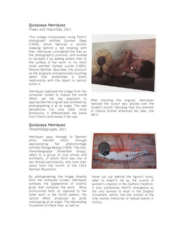 This collage incorporates Irving Penn’s photograph entitled Summer Sleep (1949), which features a woman sleeping behind a net crawling with flies. Henríquez considered the flies as the photograph’s punctum, and wished to recreate it by adding plastic flies to the surface of her work. In his short novel entitled Camera Lucida (1980), Roland Barthes describes the punctum as the poignant and personally touching detail that establishes a direct relationship with the object or person within it. Henríquez captured the image from her computer screen to induce the moiré effect, yet her key approach to appropriate the original was achieved by photographing it at an angle. The new perspective not only adds more dimension; it differentiates her piece from Penn’s and makes it her own.