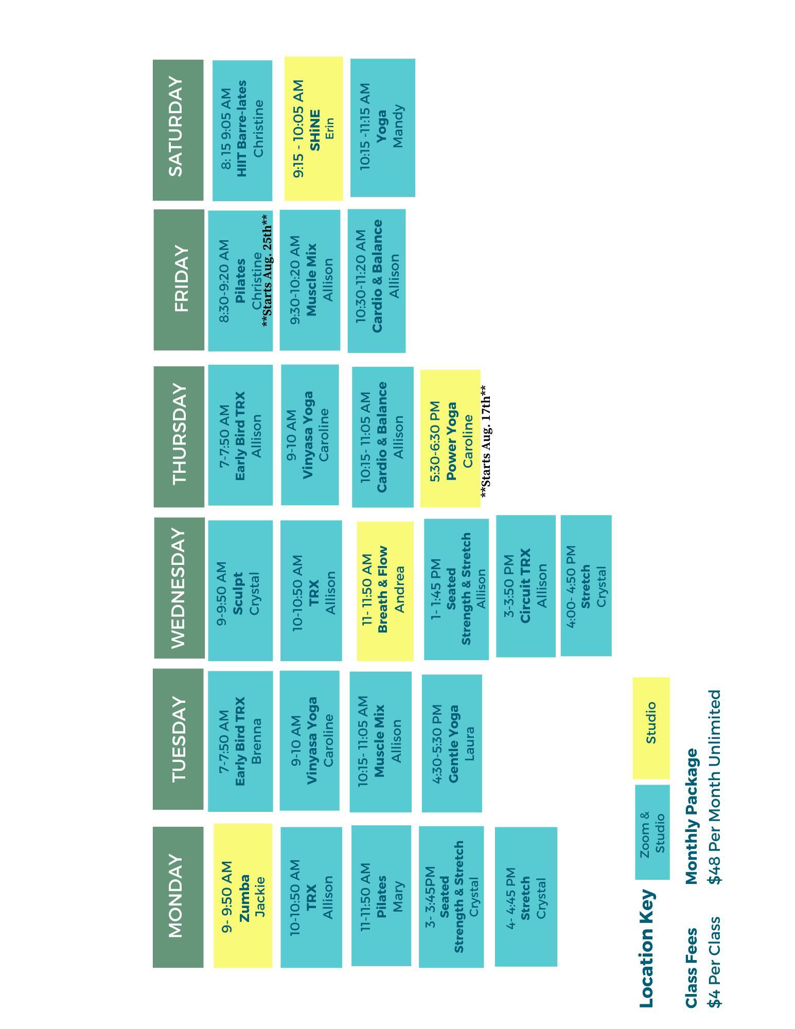 We have a variety of classes for all skill levels The cost is $4/class or $48/month for unlimited zoom and in studio group exercise classes