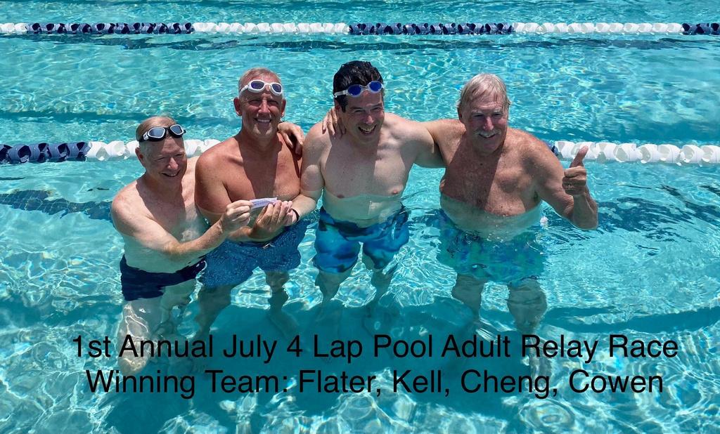 Congratulations to the winners of the 1st Annual July 4th Lap Pool Adult Relay Race! The Winning Team: Jeff Flater, Gregory Kell, Larry Cheng, and Peter Cowen Way to go, fellas!