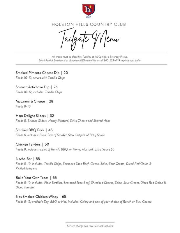 With the kickoff of Football time, please think of Holston Hills with your Catering needs We have released our new Tailgate To-Go Menu Which is showcased on this page and is located on the HHCC website under the dining tab Let us do the cooking for your tailgate party!