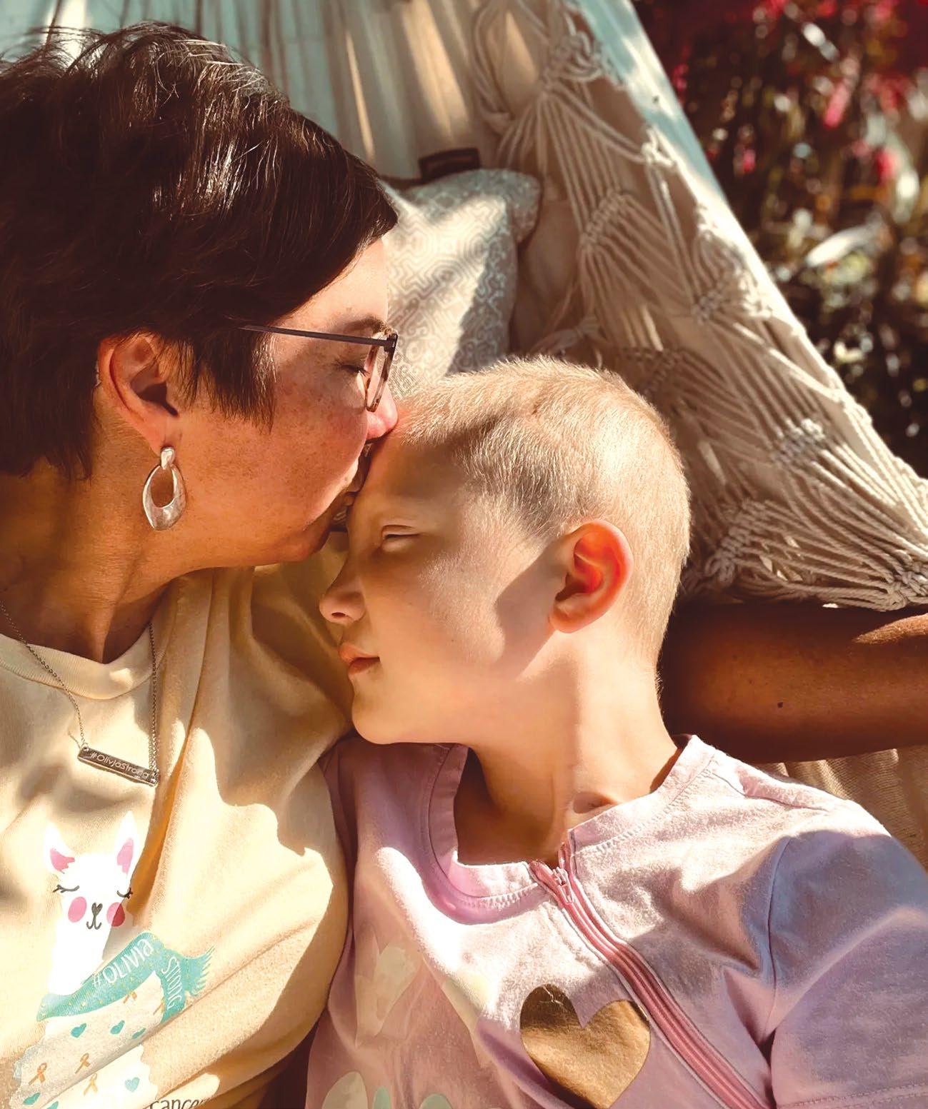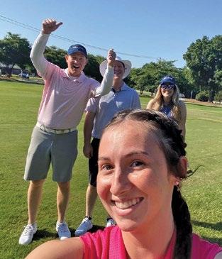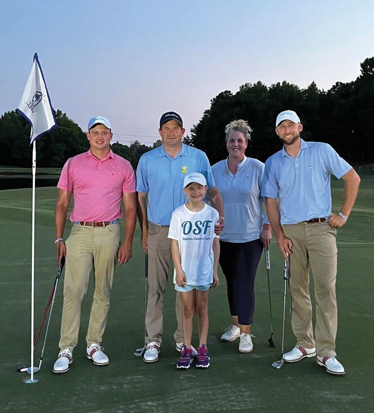 (LEFT) Mother and daughter celebrate Olivia’s last day of radiation at St. Jude in Memphis after Olivia completed 28 rounds of proton radiation. (BELOW) Olivia takes front and center at the OliviaStrong Foundation Marathon Golf event at McConnell Golf’s Providence Country Club in Charlotte, North Carolina, with pros (from left) Kory McElvaney, Kevin Reardon, Michael Leah Baxley and Zack Maybank.