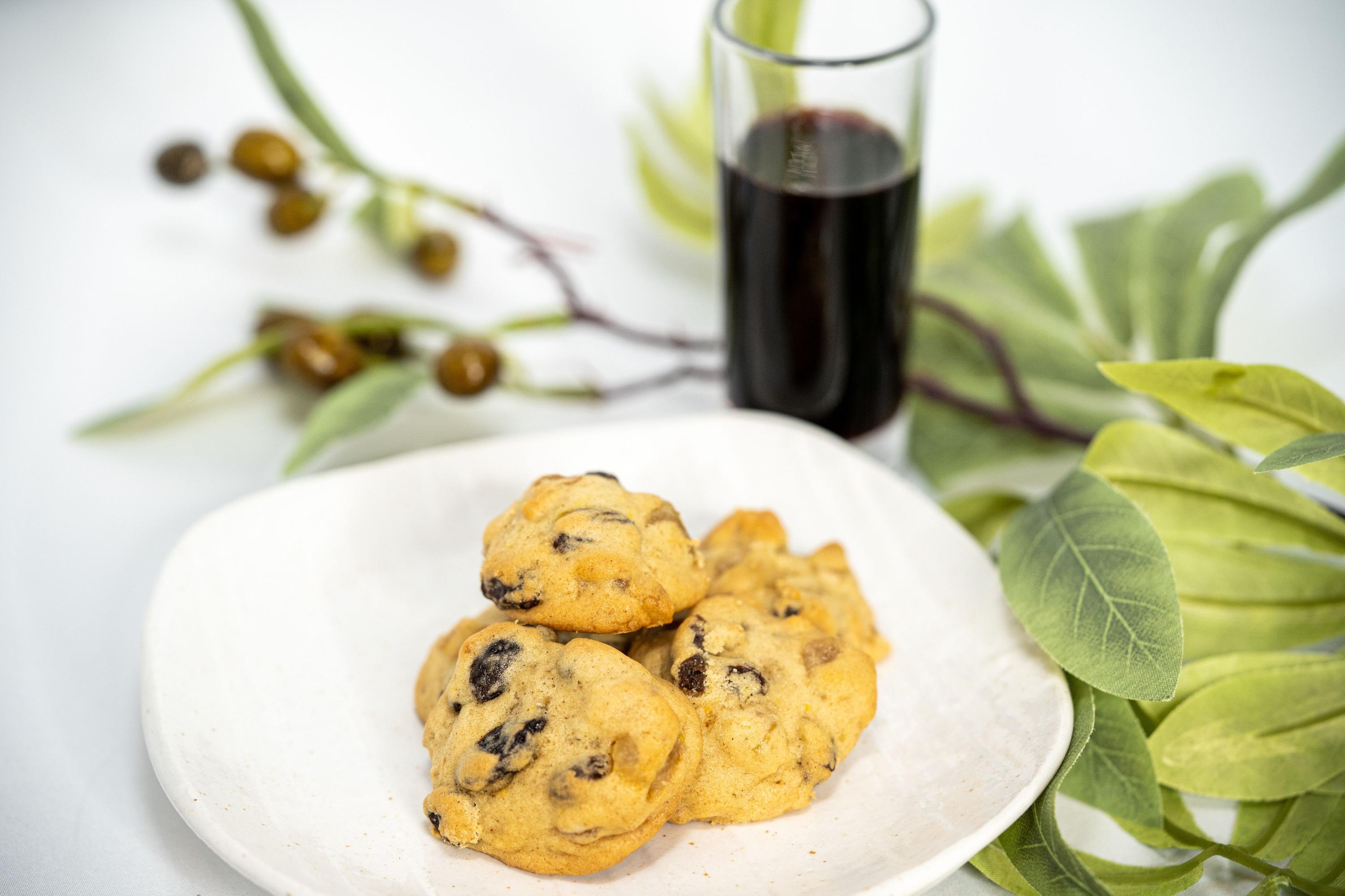 Putabout2tablespoonsofflourinabowlandtossinthefruitandnuts Placethe sugar and butter in a large mixing bowl and cream with paddle attachment until lightandfluffy Addtheeggsandbeatuntilwellblended Addthedryingredients tothecreamedbuttermixture,alternatingwiththebakingsodamixtureandwine until a moist dough has formed. Add the floured fruits and nuts into the batter andfolduntilwellcombined.Dropthebatterontoparchmentpaperlinedbaking sheets using a tablespoon or small cookie scoop Leave about 1½ inches of space between cookies Bake in a 350°F preheated oven for 12-15 minutes or until the bottoms are browned. The cooking time will depend on the size of the cookies Let cool on a rack and store in an airtight container for up to one week, orlongerifstoredinacoldplace