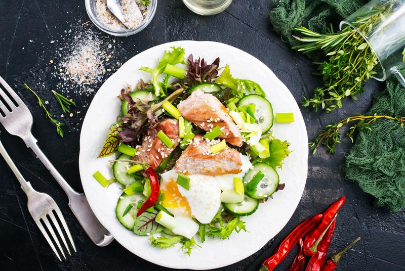 Tomatoes ,Cucumbers, Shaved Onion, Carrots, Red Peppers, Sliced Almonds, Hard Boiled Eggs, Crumbled Bacon, Black Olives, Feta Cheese, Cheddar Cheese, Selection of Club Dressings, Chicken, Salmon, Bread