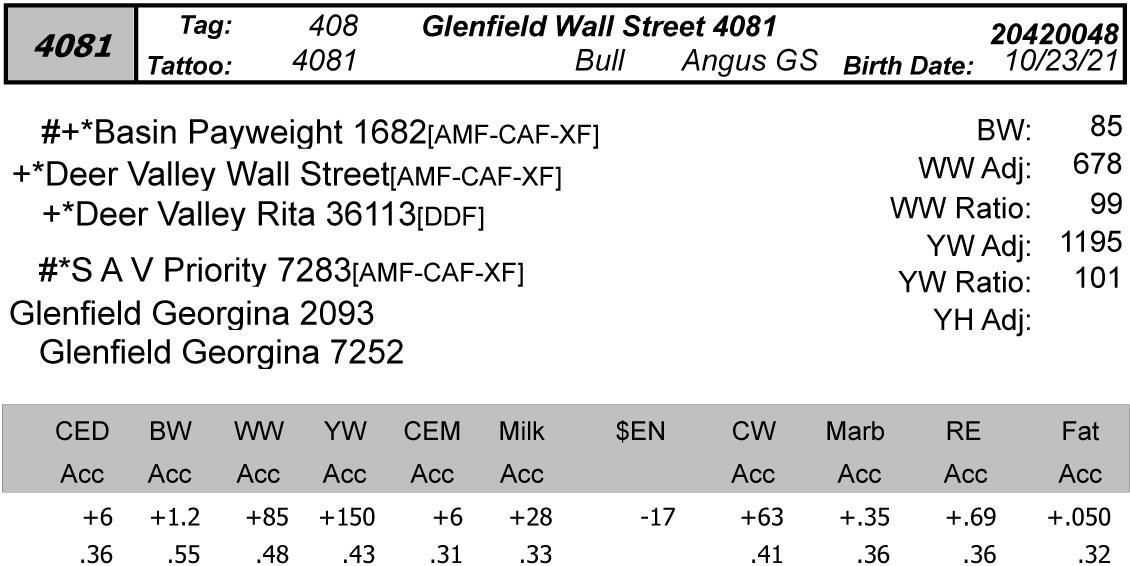 45 GLENFIELD WALL STREET 4081 20420048 ANGUS GS Birth Date: 10/23/21 NOTES: Gain Ratio: 113