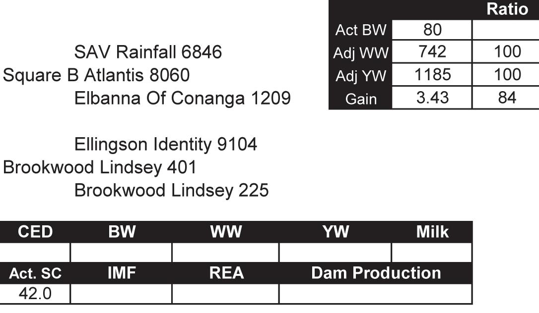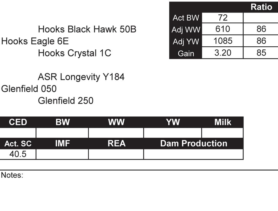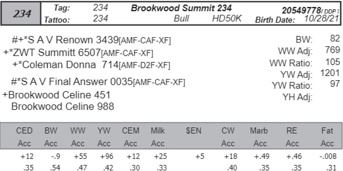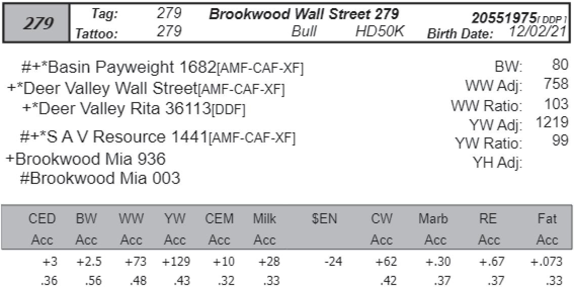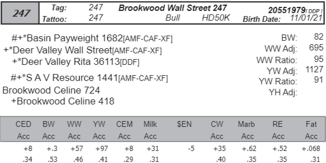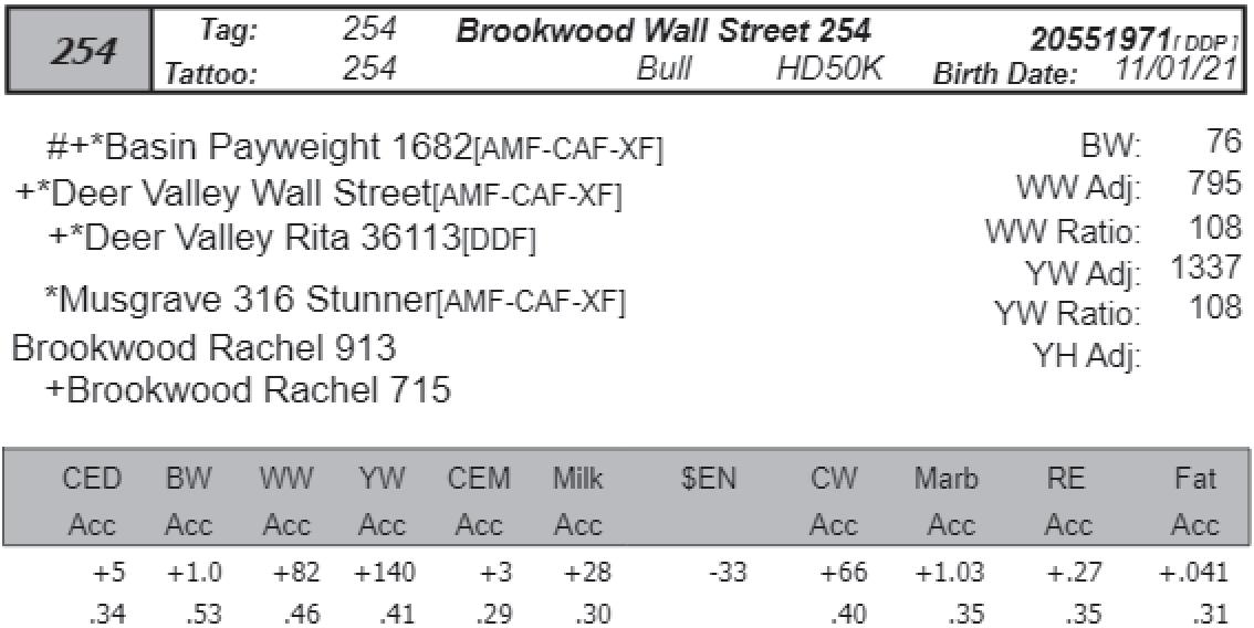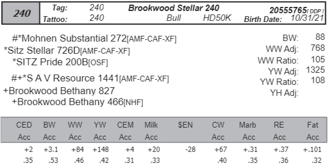 19 BROOKWOOD WALL STREET 247 20551979 DDP HD50K Birth Date: 11/01/21 Lot 17 BROOKWOOD STELLAR 240 20555765 DDP HD50K Birth Date: 10/31/21 NOTES: Gain Ratio: 97
