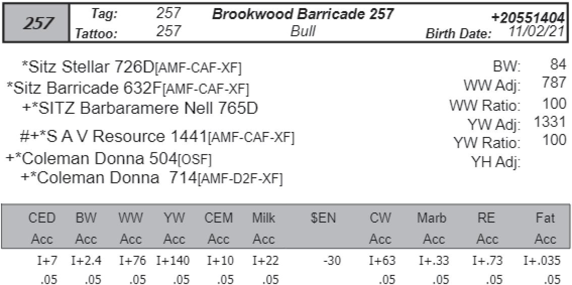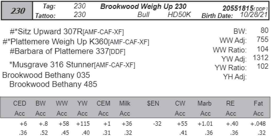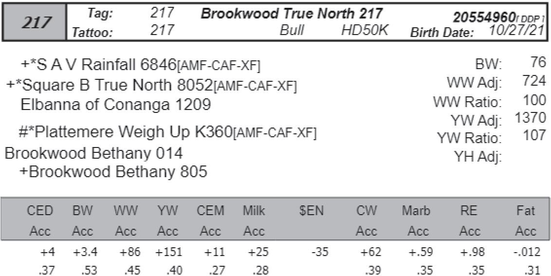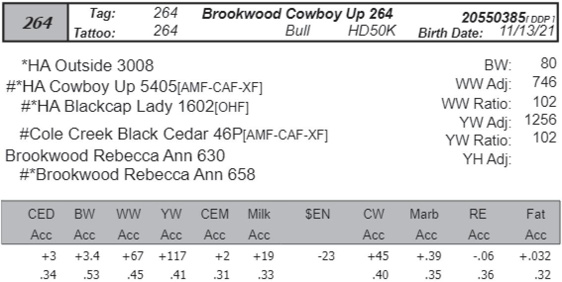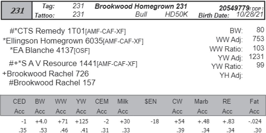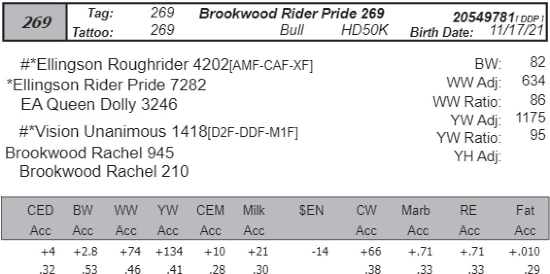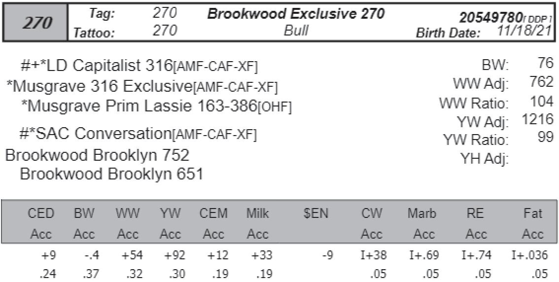 BROOKWOOD EXCLUSIVE 270 20549780 DDP HD50K Birth Date: 11/22/21 NOTES: Gain Ratio: 85 Best clerks in the business!