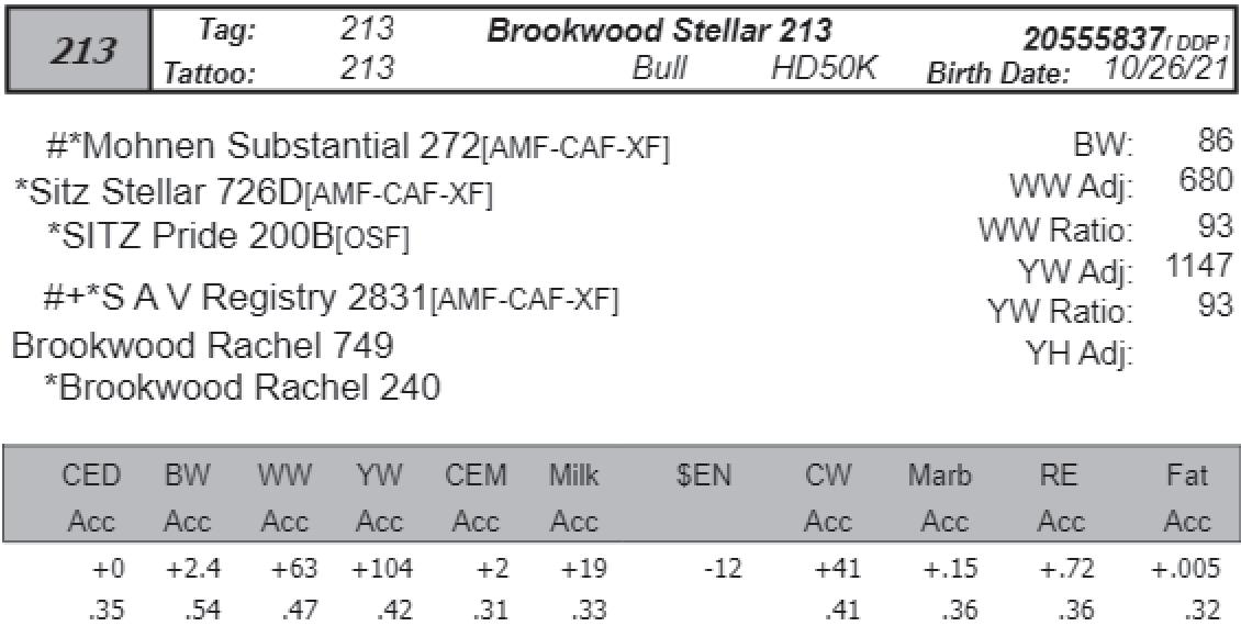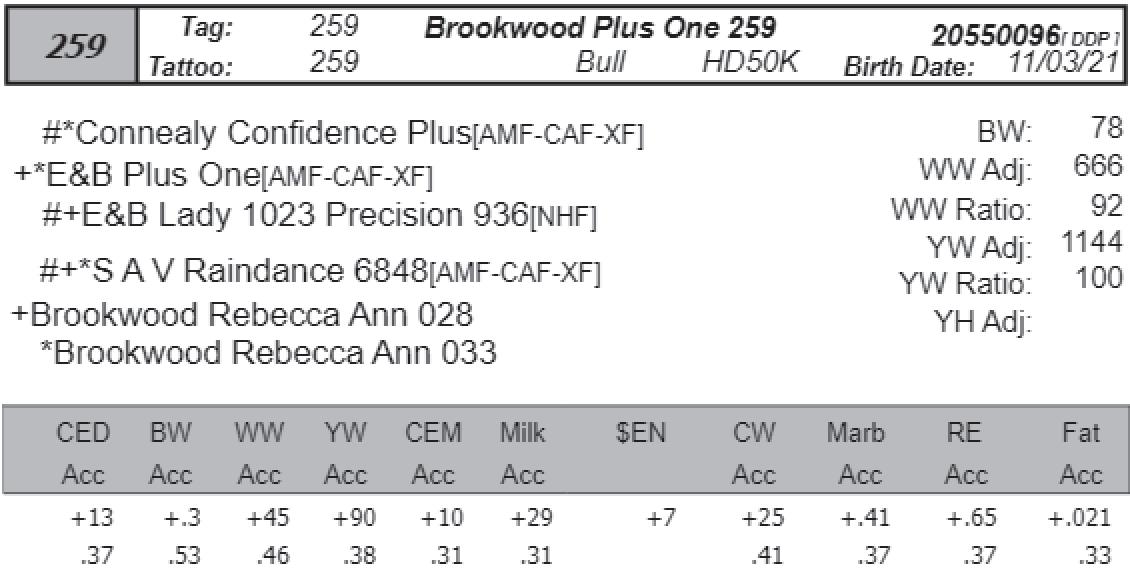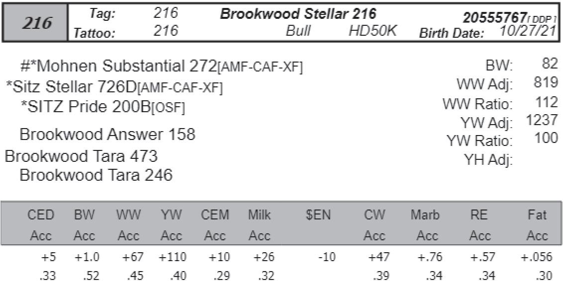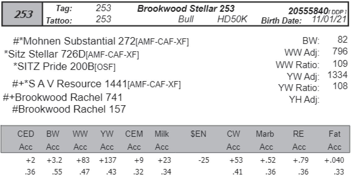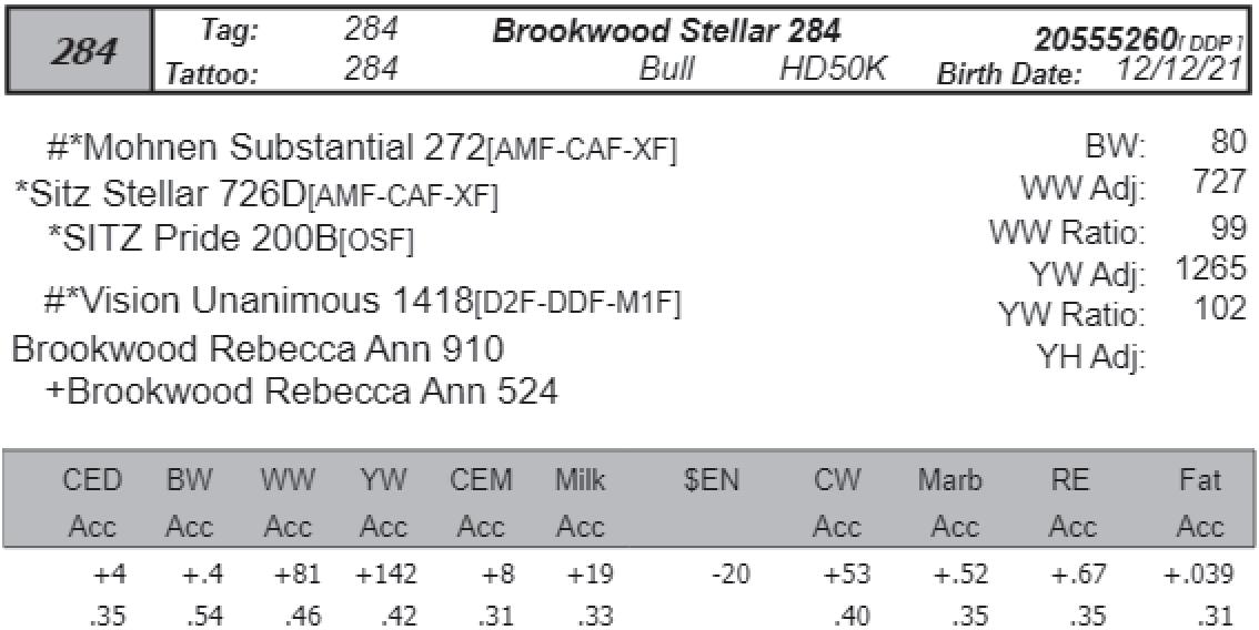 4 NOTES: Gain Ratio: 89 NOTES: Gain Ratio: 94 NOTES: Gain Ratio: 105 Lot 1 BROOKWOOD STELLAR 201 20555956 DDP HD50K Birth Date: 10/19/21