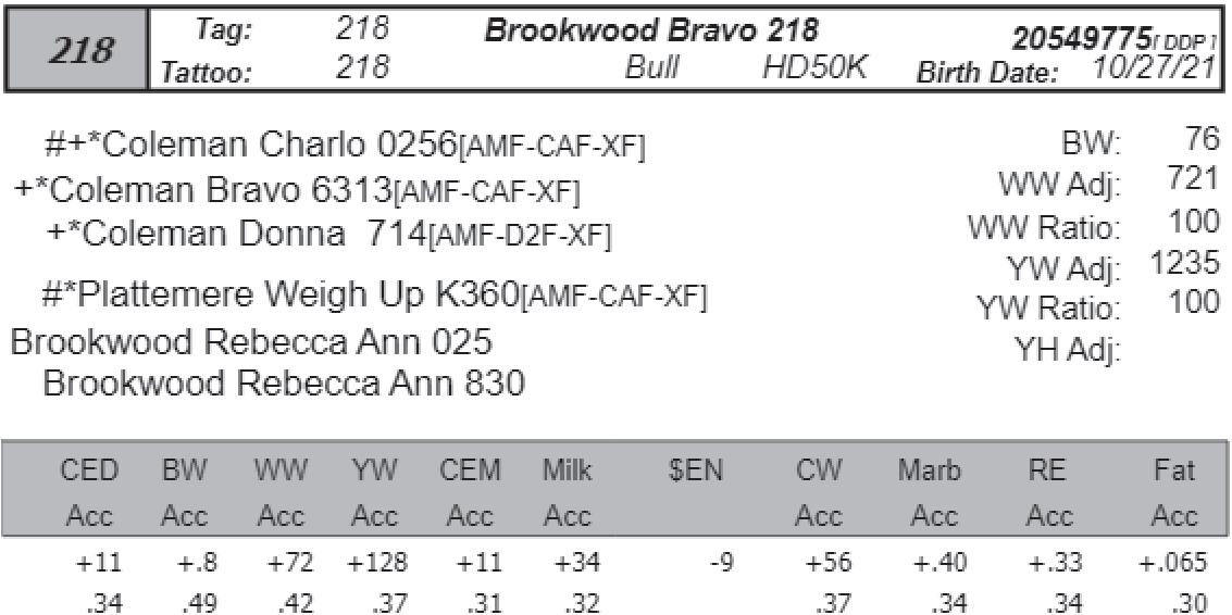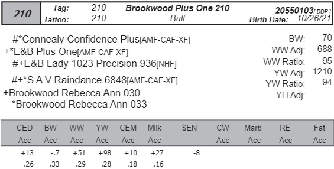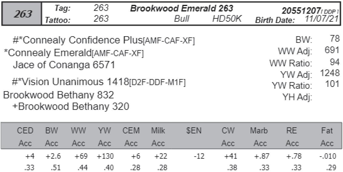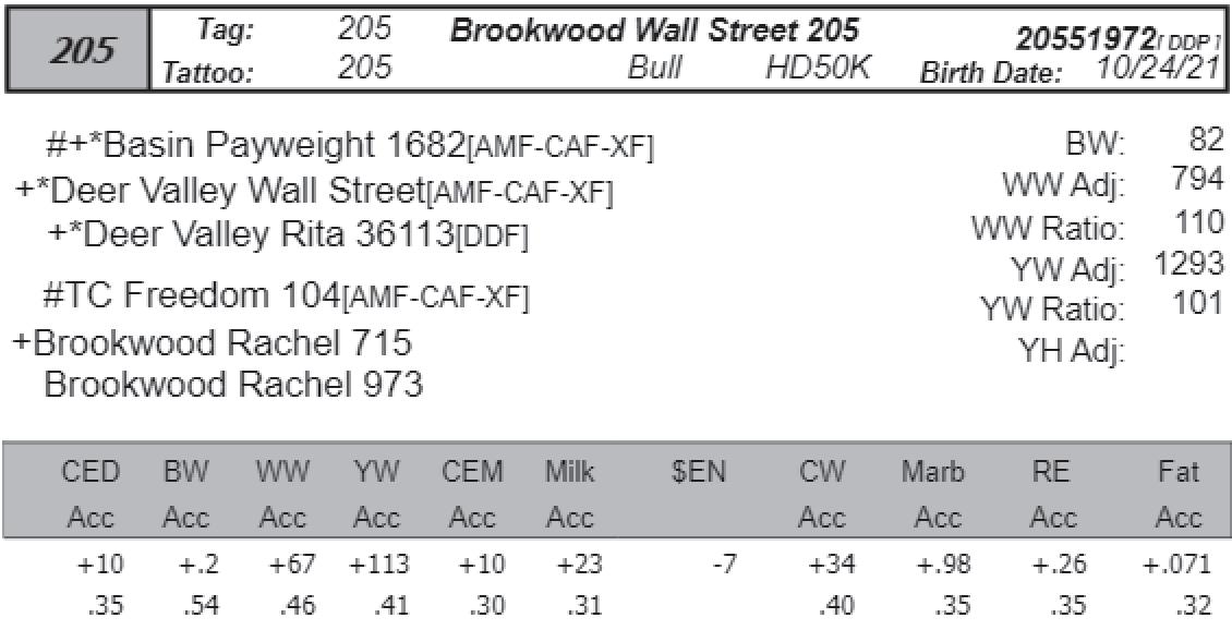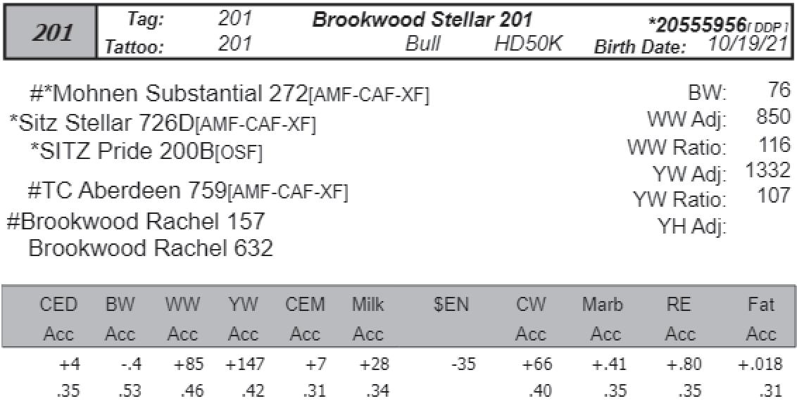 4 NOTES: Gain Ratio: 89 NOTES: Gain Ratio: 94 NOTES: Gain Ratio: 105 Lot 1 BROOKWOOD STELLAR 201 20555956 DDP HD50K Birth Date: 10/19/21