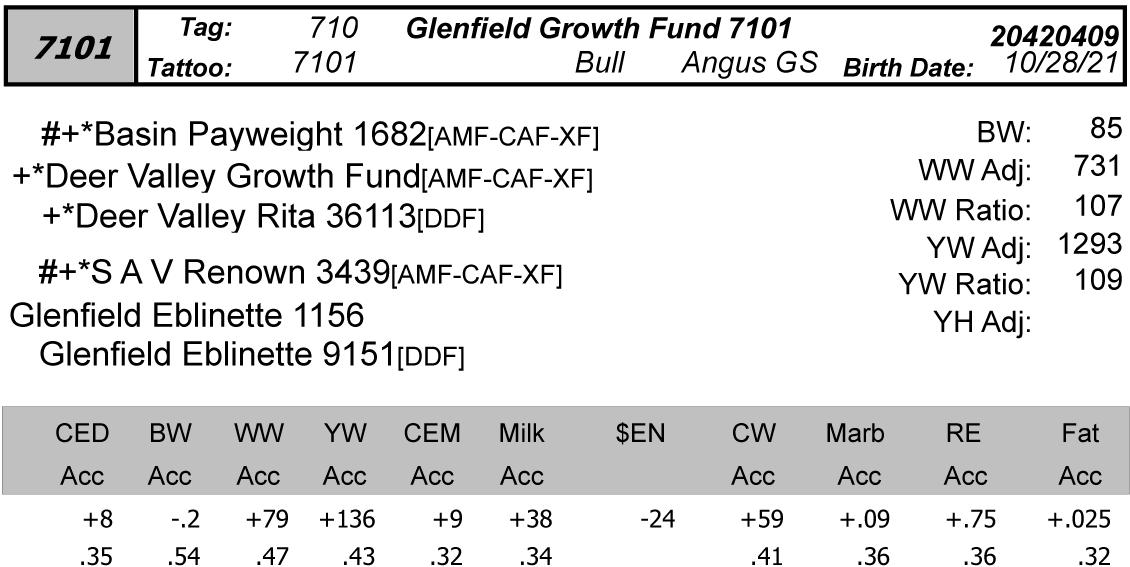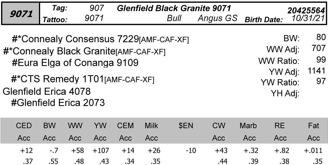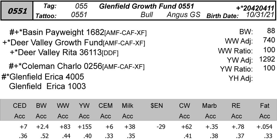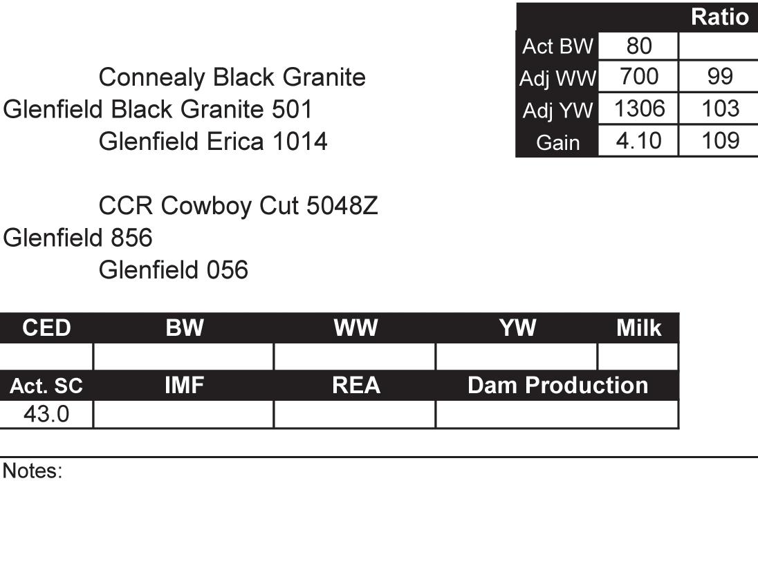 56 GLENFIELD GROWTH FUND 0551 20420411 ANGUS GS Birth Date: 10/31/21 NOTES: Lot 57 GLENFIELD BLACK GRANITE 9071 20425564 ANGUS GS Birth Date: 10/31/21 NOTES: Gain Ratio: 103 Gain Ratio: 98 NOTES: Gain Ratio: 102 NOTES: Gain Ratio: 93