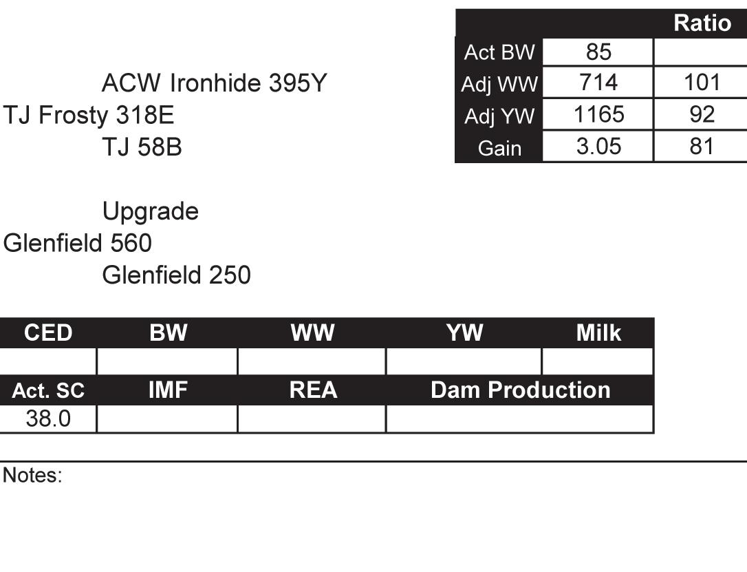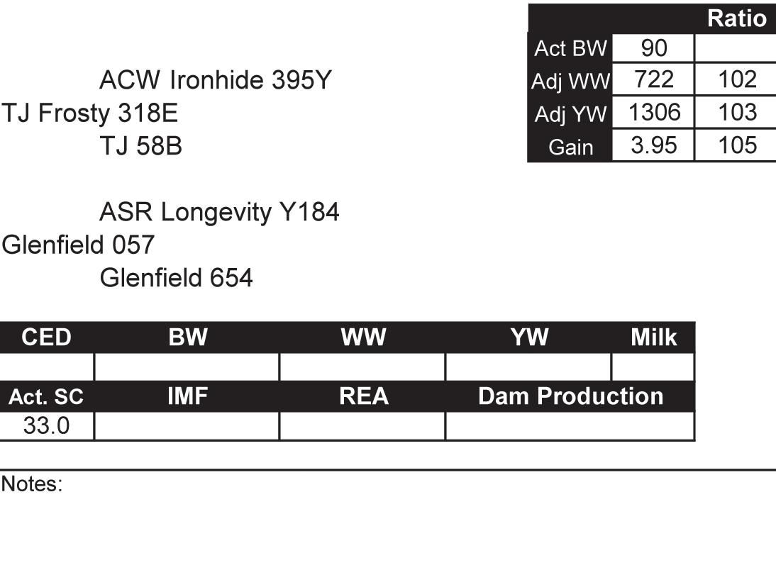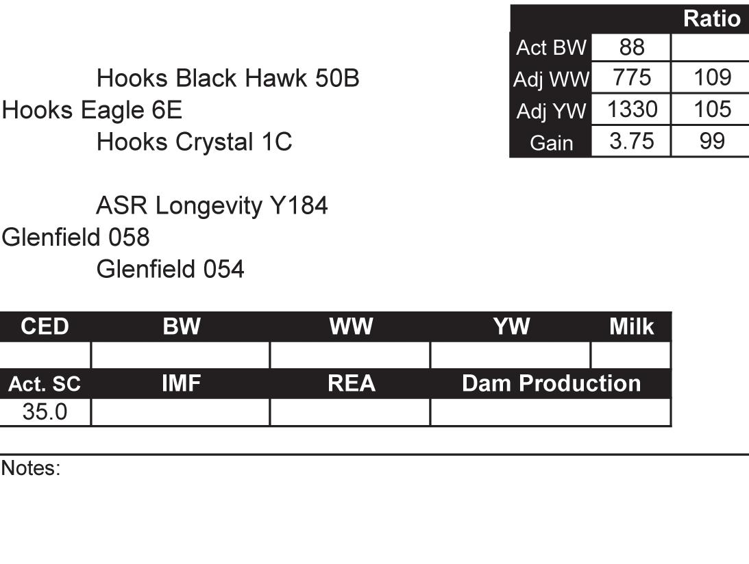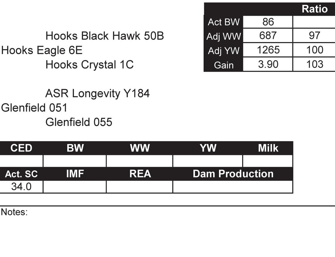 56 GLENFIELD GROWTH FUND 0551 20420411 ANGUS GS Birth Date: 10/31/21 NOTES: Lot 57 GLENFIELD BLACK GRANITE 9071 20425564 ANGUS GS Birth Date: 10/31/21 NOTES: Gain Ratio: 103 Gain Ratio: 98 NOTES: Gain Ratio: 102 NOTES: Gain Ratio: 93